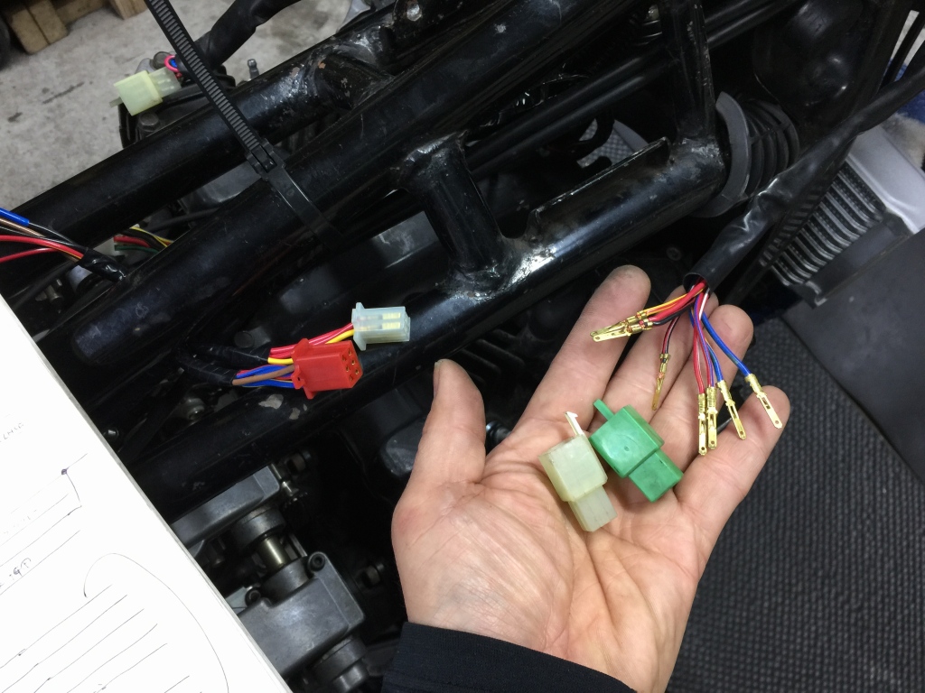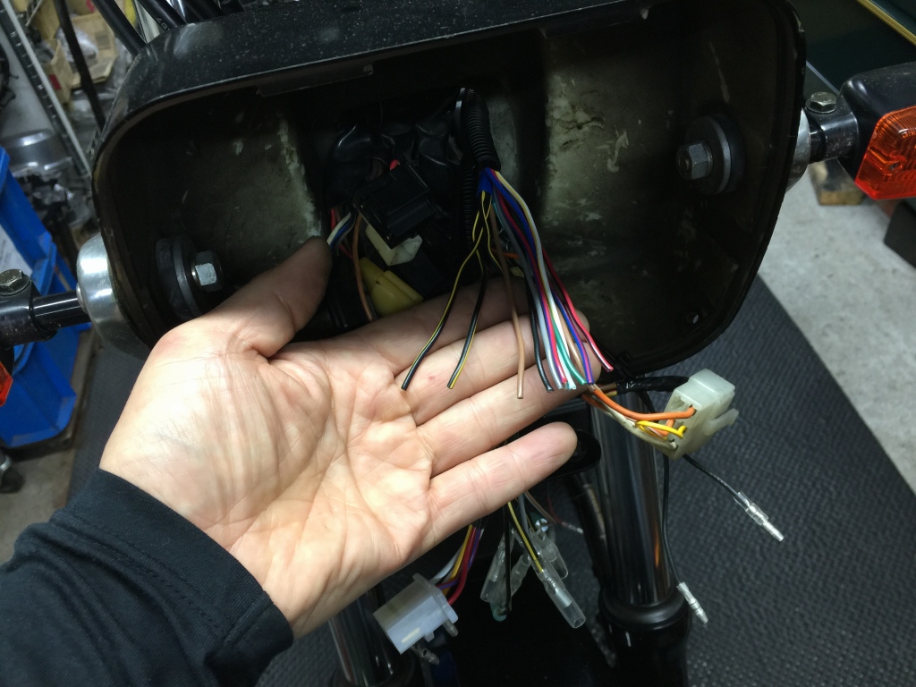 右ハンドルスイッチの接続です。こちらも全て分解して、回路を解読して繋ぎ直します。