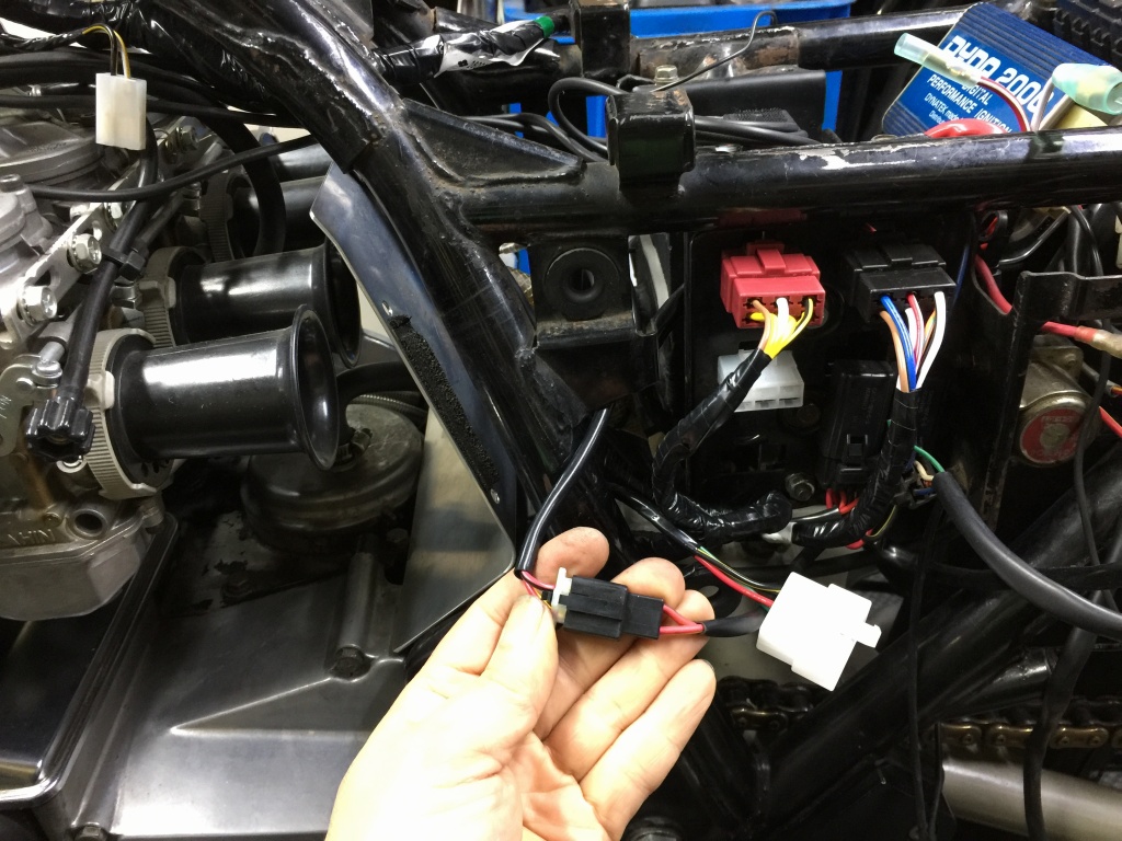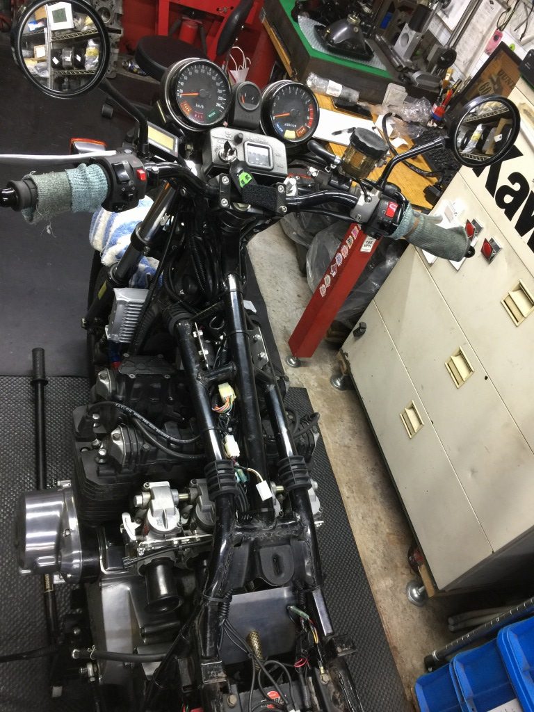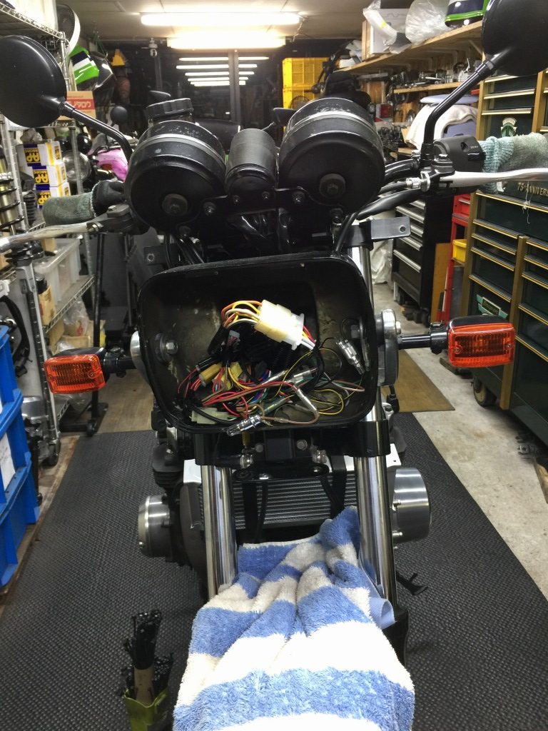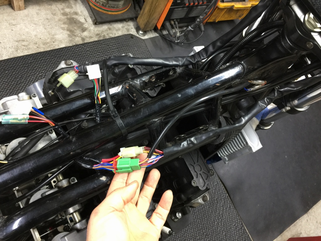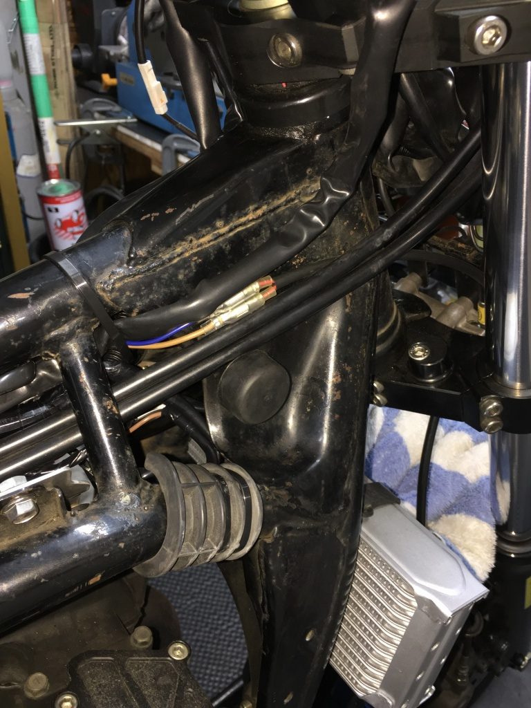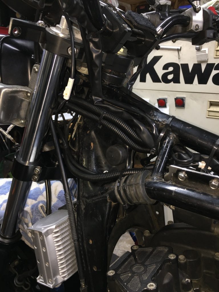 ステム周りのハーネスはこんな感じです。スリム化したのでムリ無くタンクとフレームの間を通るようになります。