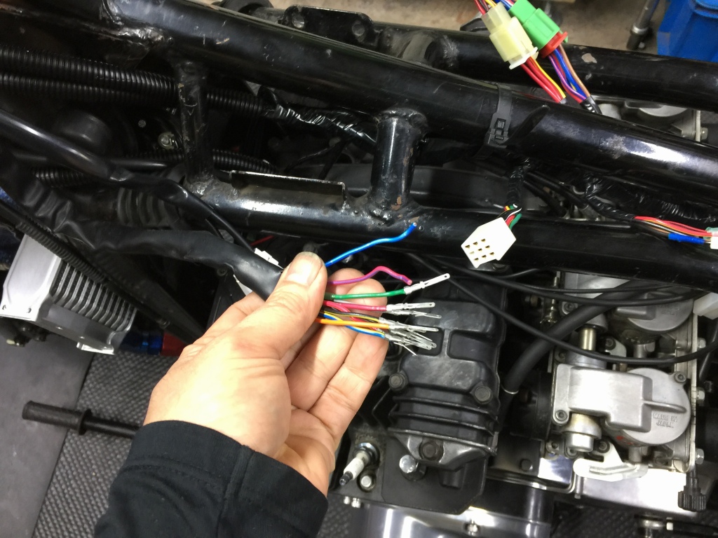 メーター行のハーネスは一旦端子を切断し、4つのメーターに合うように分岐させたりして改造します。