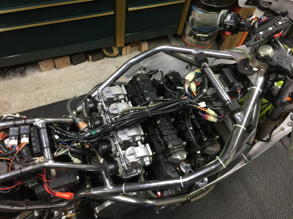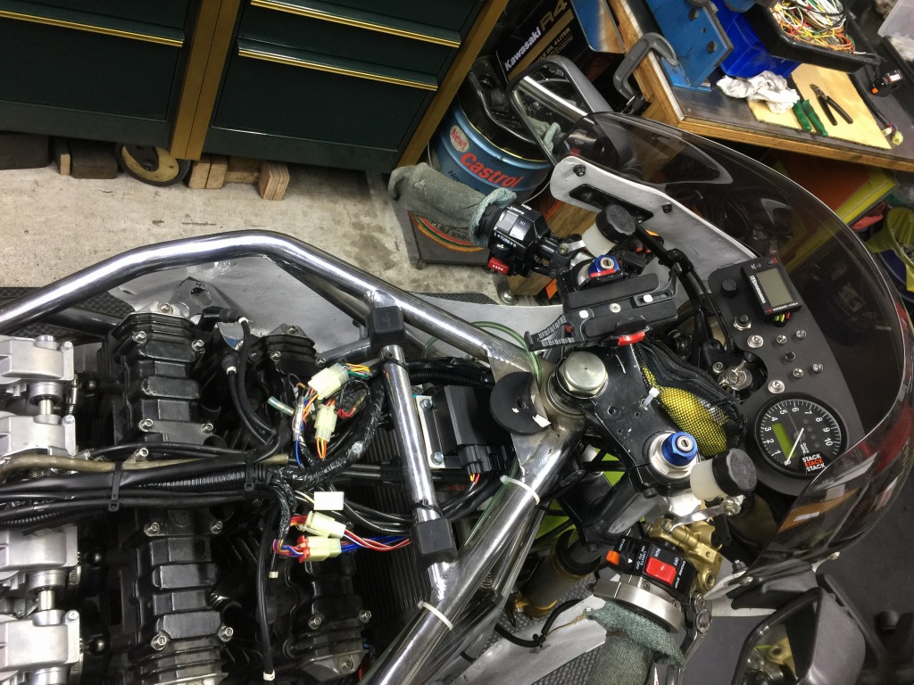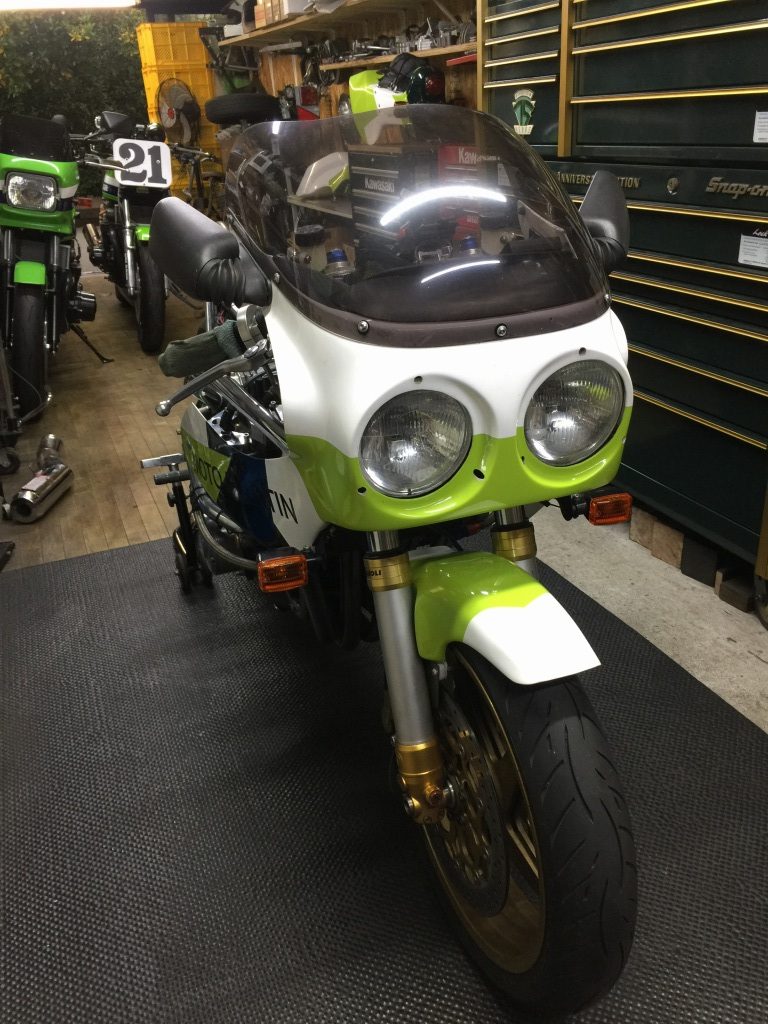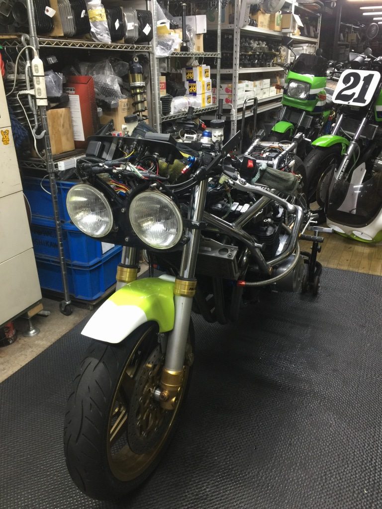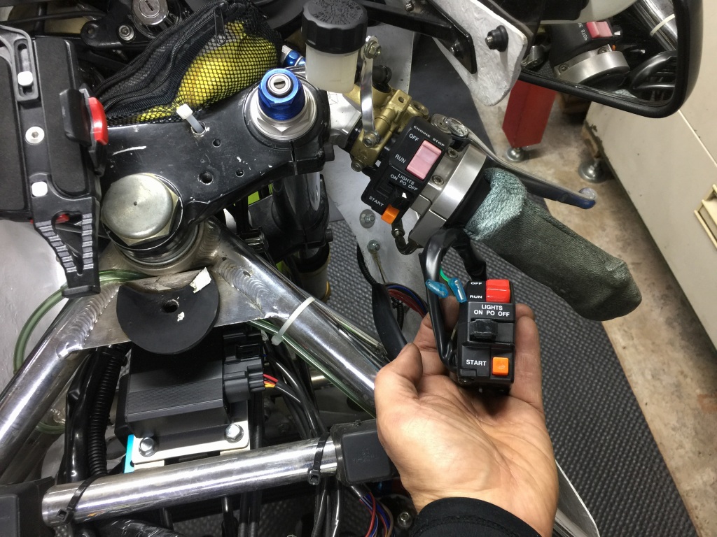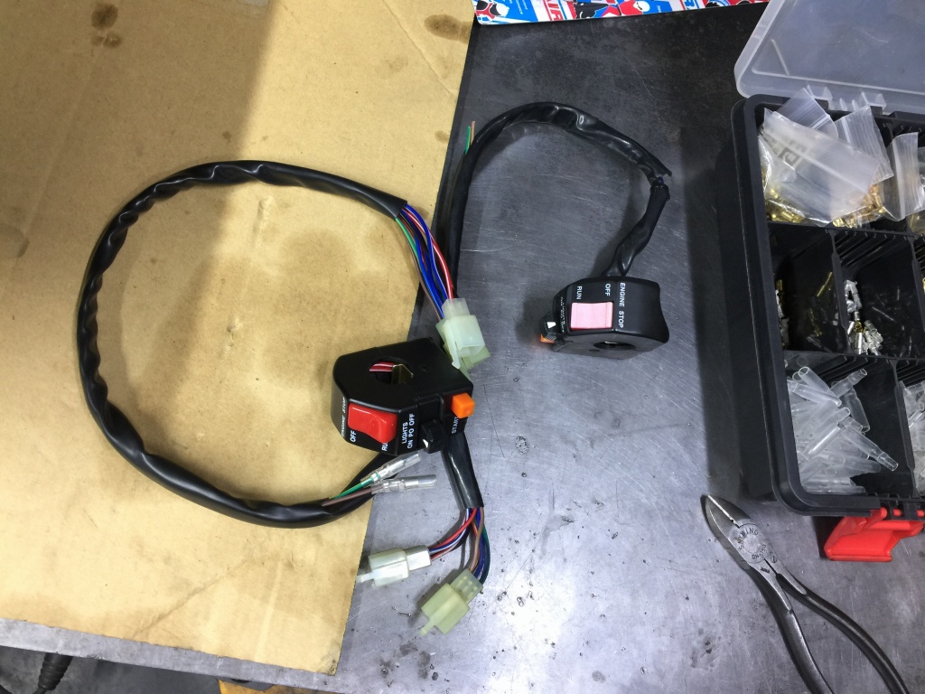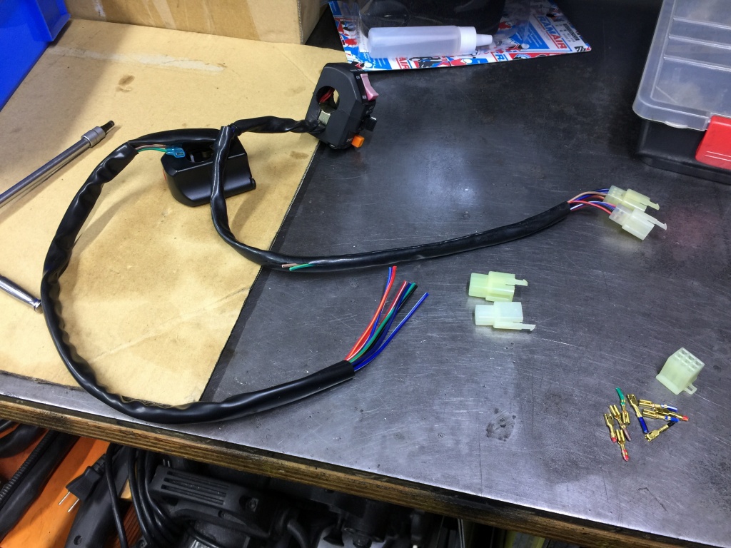 投稿日: 2018年10月31日 投稿者: greengarageモトマーチンZ F様 ハンドルスイッチ交換 エンジンマウントボルトの入荷待ちのため、周辺のこまごまとしたところを進めます。 ウオタニのピックアップを組み付けます。 フロントカウルを取り付けます。 キャブ周りを取り付けます。 右のハンドルスイッチは、劣化してボタンの色があせており、スターター不動の要因のひとつとも考えられるので新品交換します。 素材は汎用品なので、使用しているZ1000R2メインハーネスに合うようカプラー周りを改造します。 改造完了です。 先に接続だけして動作確認します。 ハンドルスイッチ交換完了です。