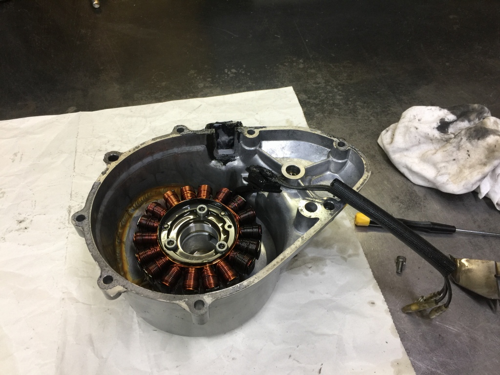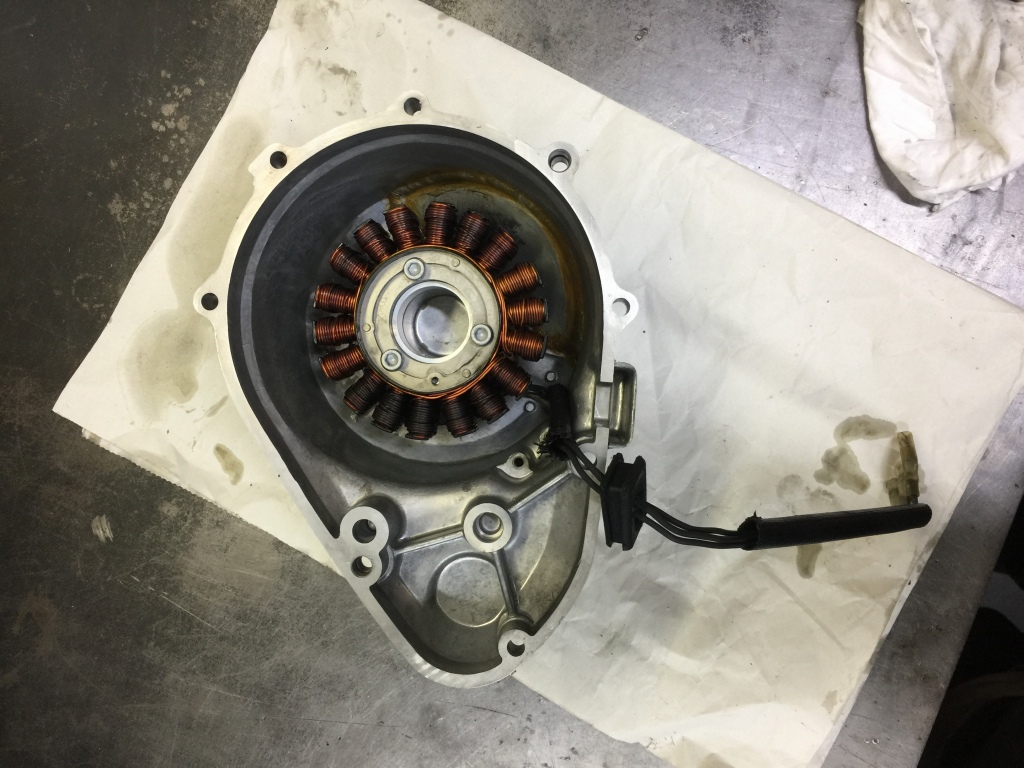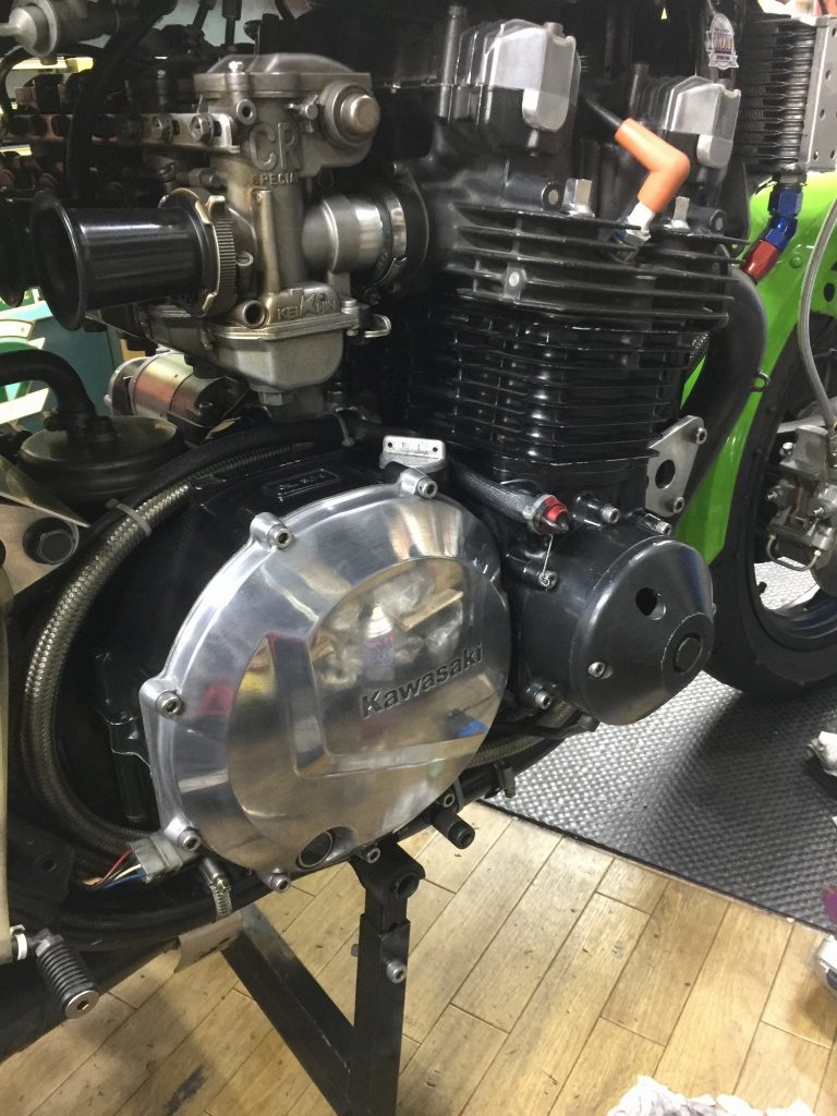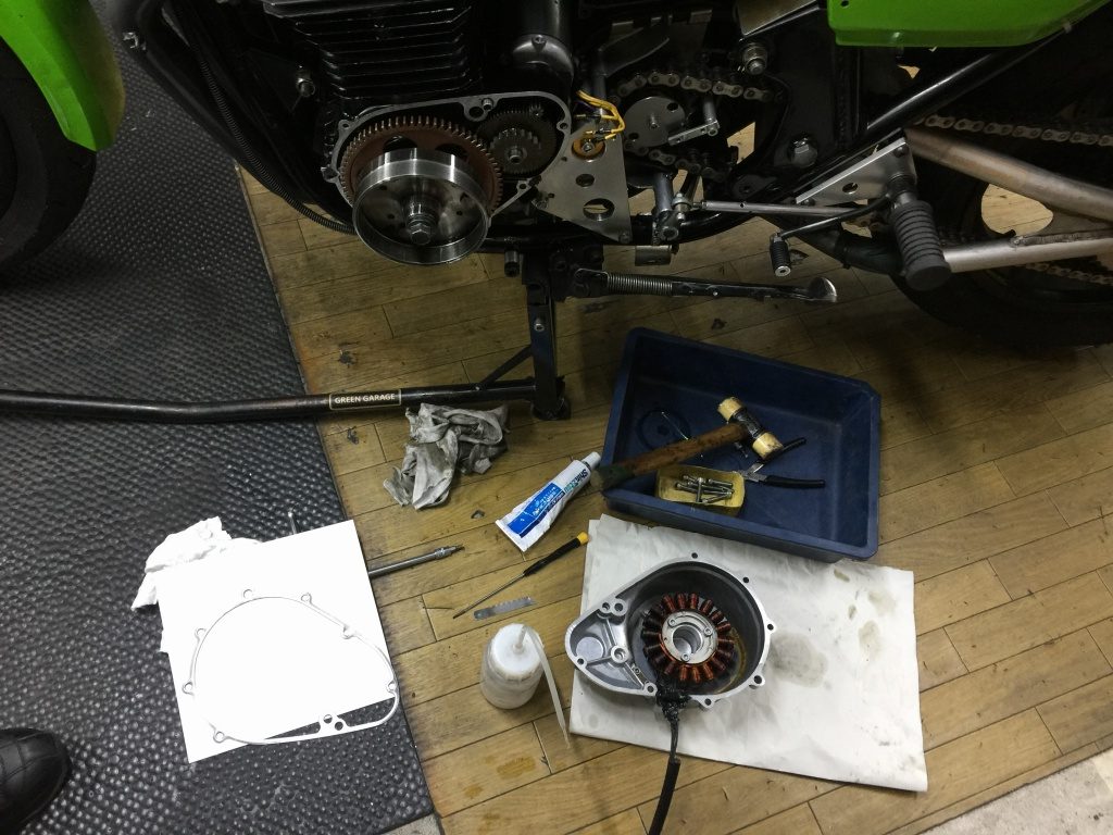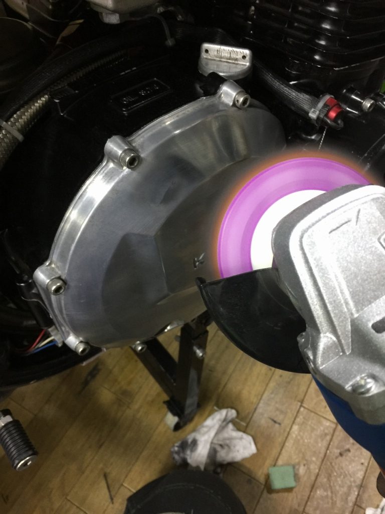 投稿日: 2018年11月6日 投稿者: greengarageデモ車#21 TOTの準備 オイル漏れ修理 TOTに向けてマシンの準備を進めます。 ジェネレーターカバー辺りからオイル漏れするので、分解して点検します。 特に異常は見られないので、グロメットのハーネス穴から漏っていたようです。 完全に脱脂してから組み直します。 クラッチカバーは曇ってきたので軽くバフ掛けします。 ペダルに緩みがあったので、分解点検してグリスアップしておきます。