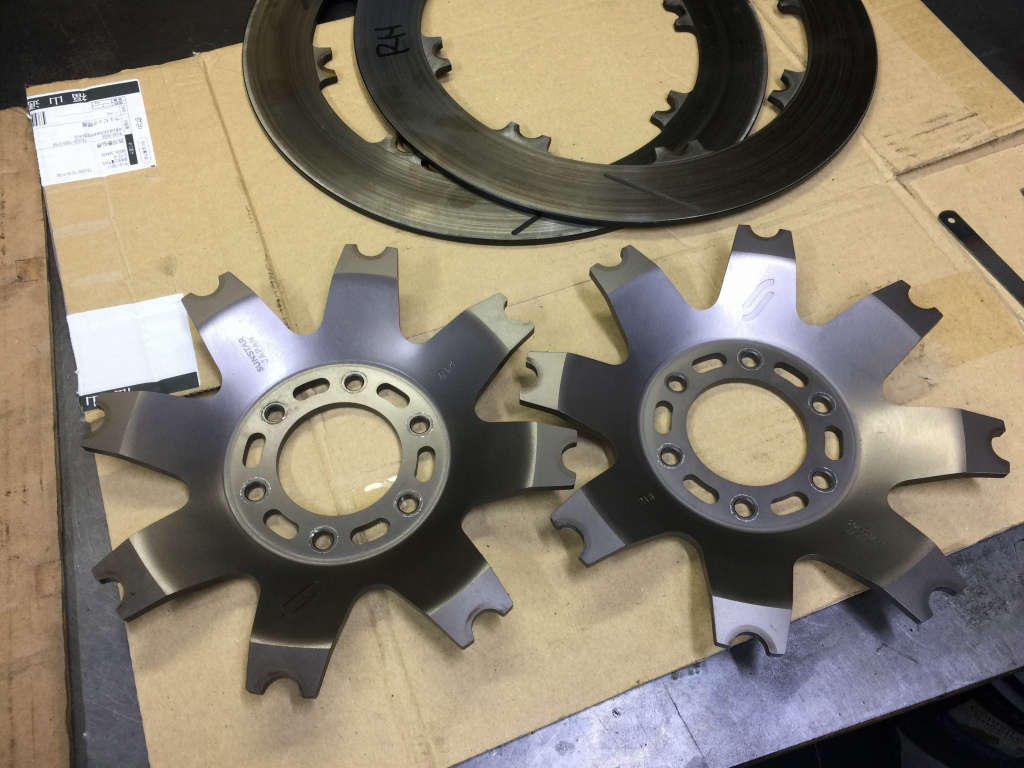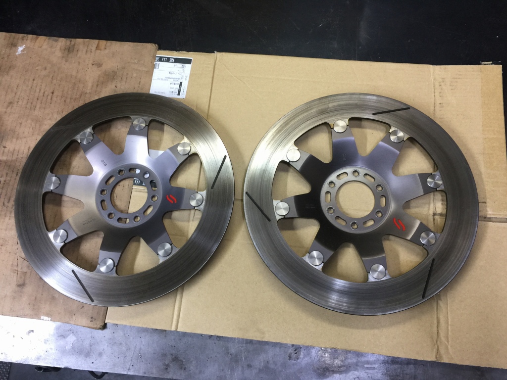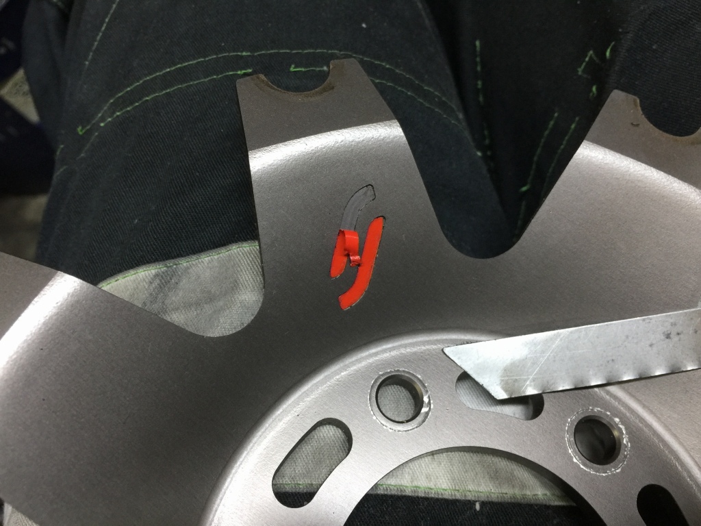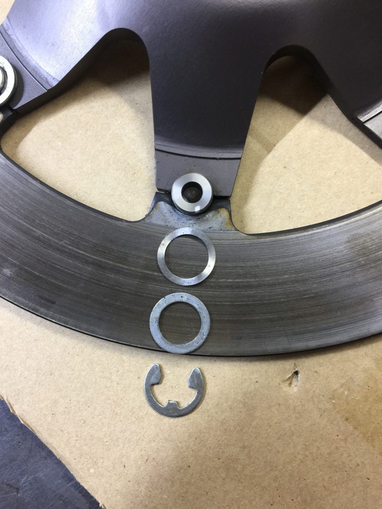 投稿日: 2018年11月8日 投稿者: greengarageZ1000Mk2 F.Y様 フロントローター分解 フロントローターの色替えをしたいとのこと。 フロントホイールを外します。 ローターを外します。 現状はインナーローターはネオクラシックローターの初めの色で、アルマイトでしょう。 フローティングピンを分解します。 インナーローターが外れました。フローティングピンやその周辺には摩耗はありません。ワッシャー類は新品交換します。 サンスターのロゴはカッティングシートなので剥がします。 剥がすとこんな感じです。 色はセラコートの半艶ブラックにする予定。