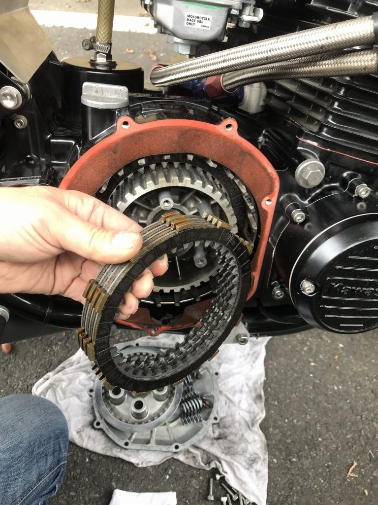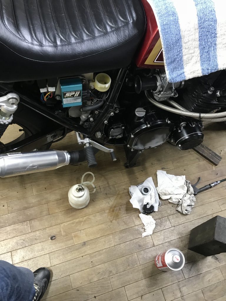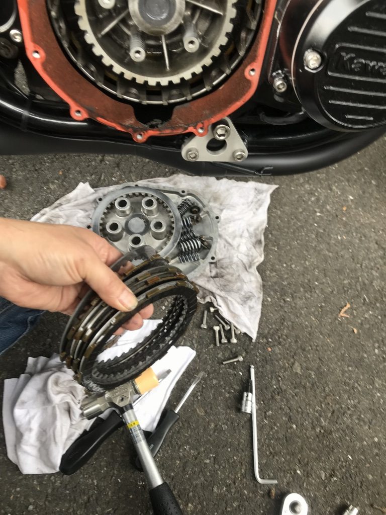 再生後、エンジンを掛けてクラッチを握り、初めてローに入れたらエンストします。何度やってもクラッチが切れていないようなのでその場で分解点検します。