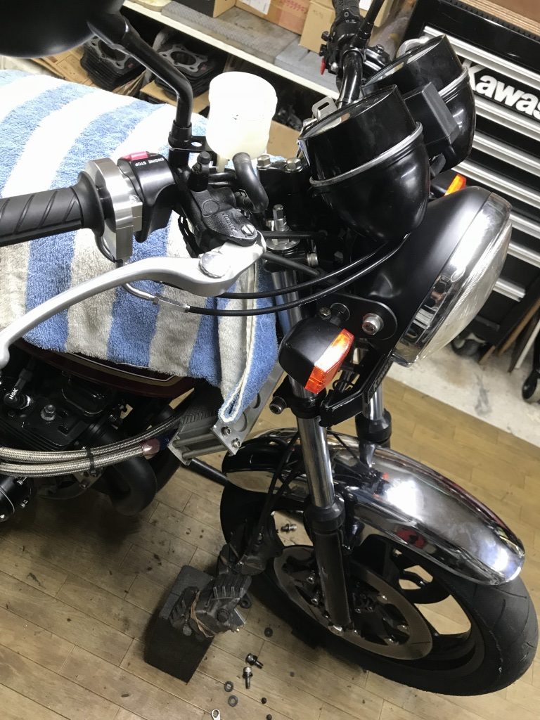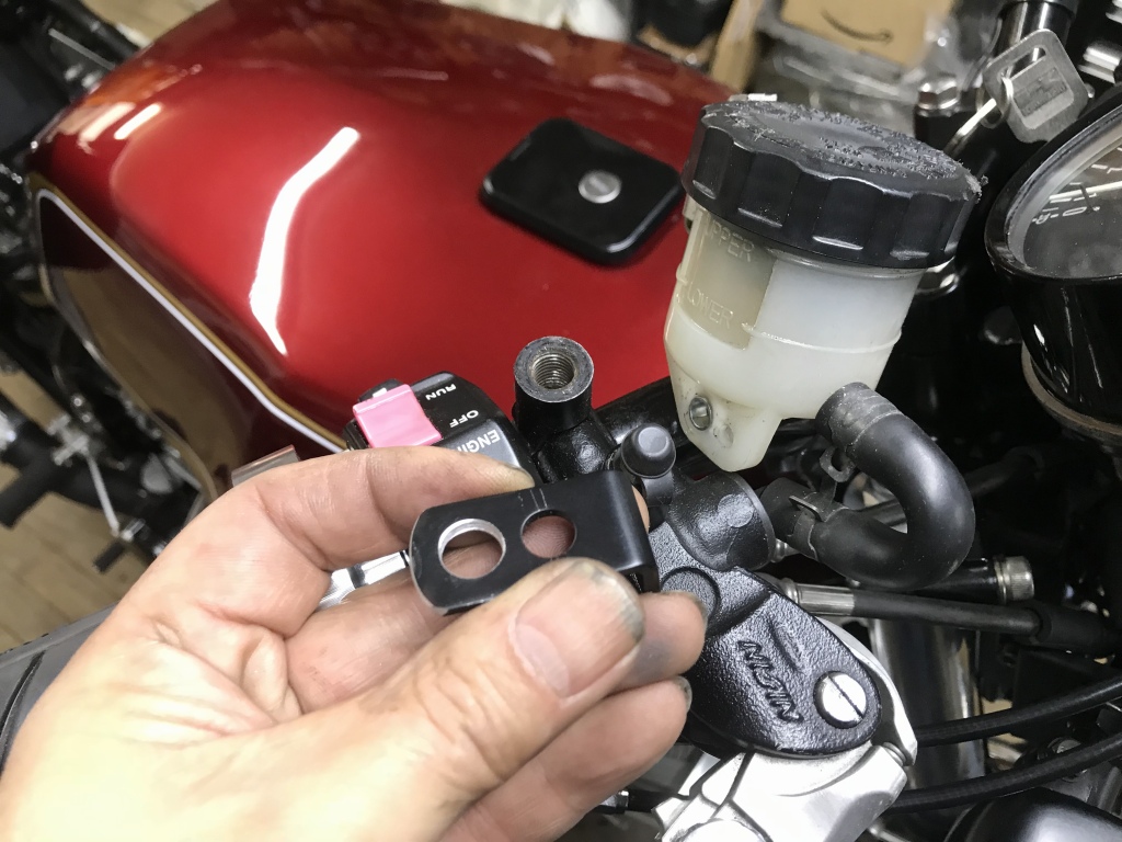続いて、フロントリザーバータンクのステーを小加工。長過ぎてメーターに被るので、ステーを短縮します。