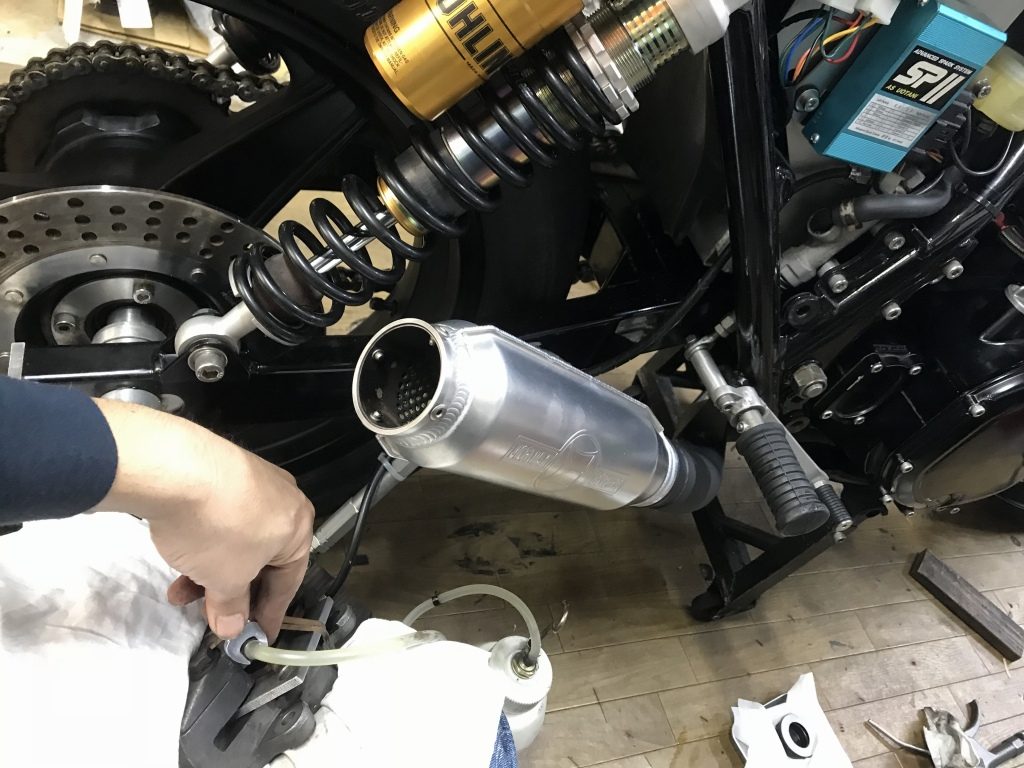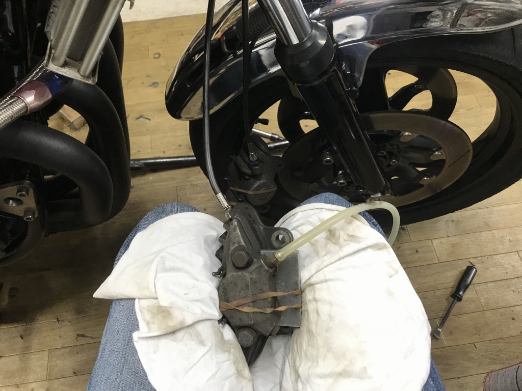 キャリパーはフロントと同じく一旦外して作業します。