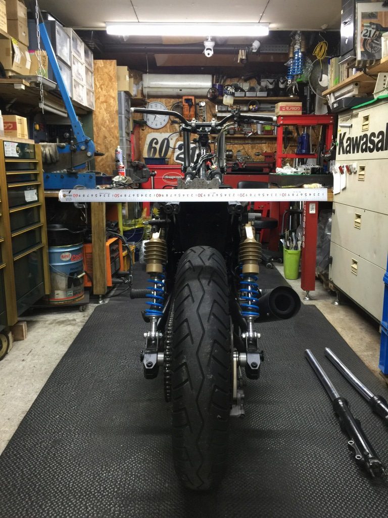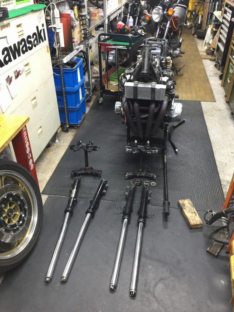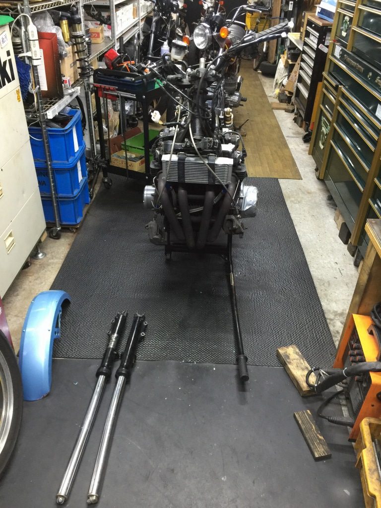 外装とマフラーも外し、この状態でフレーム修正に出します。