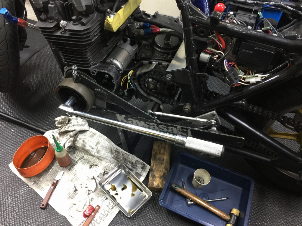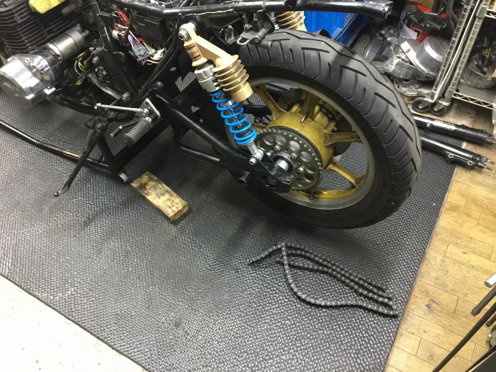 スイングアームを塗装するので、チェーンを切断して外します。