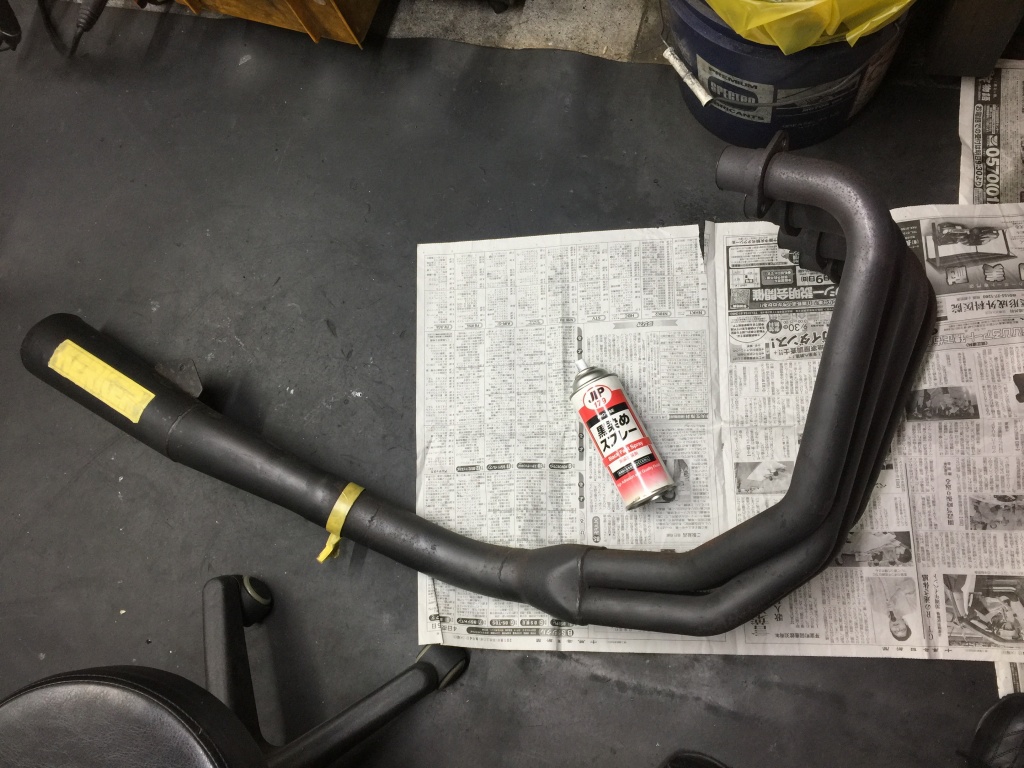 マフラーはサビが目立つので軽く落とし、黒染めスプレーで塗装します。