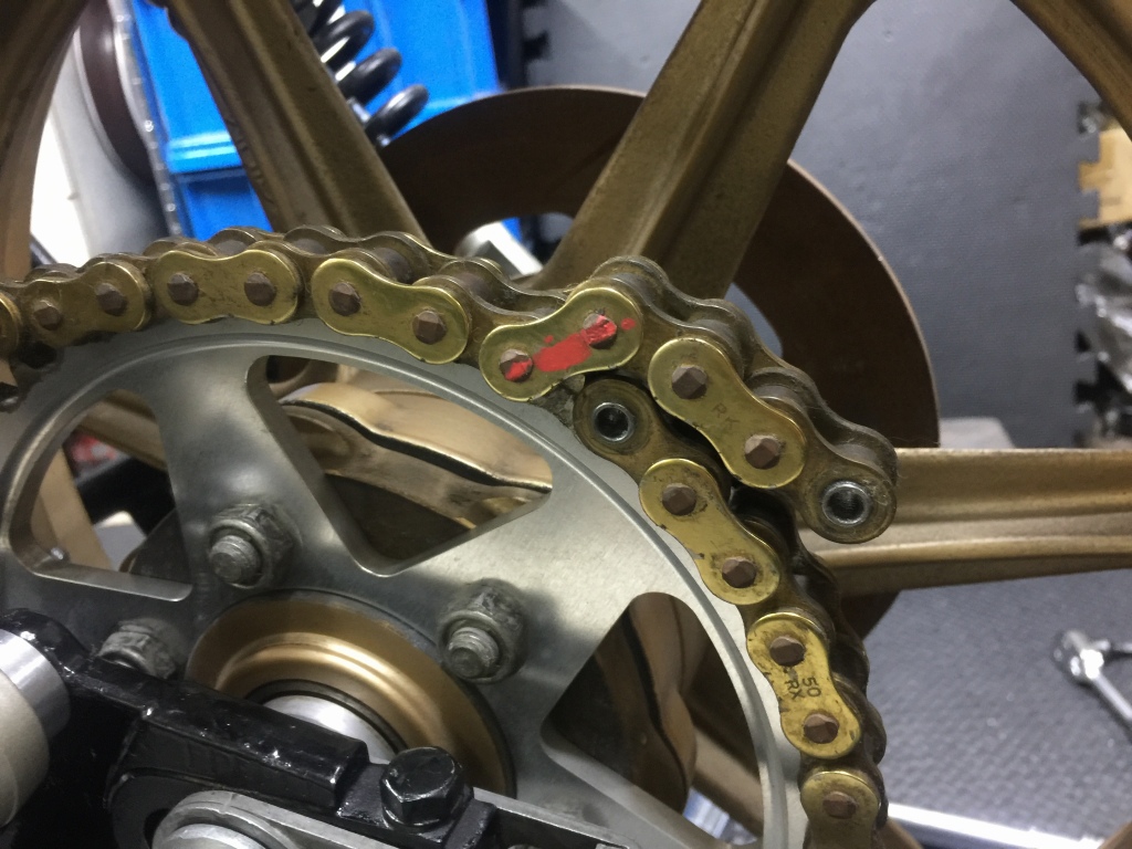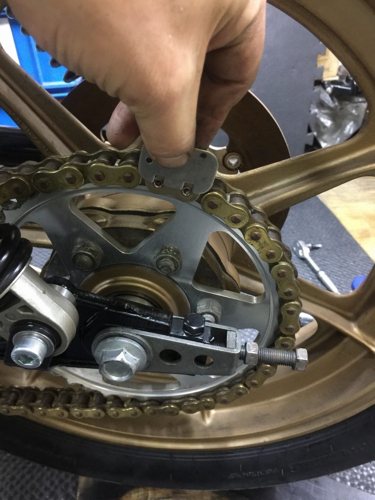 以前のアルミスイングアームがかなり長かったようで、元のチェーンを合わせてみると4コマほど切り詰める必要がありそうです。