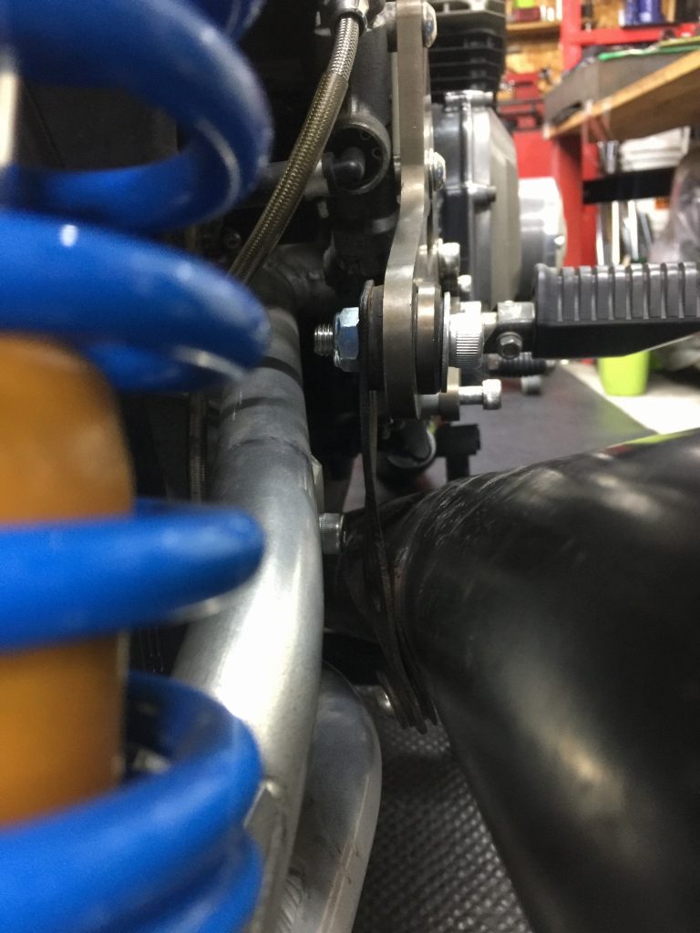 リヤブレーキのリンクの位置を変え、レバー比を大きくします。