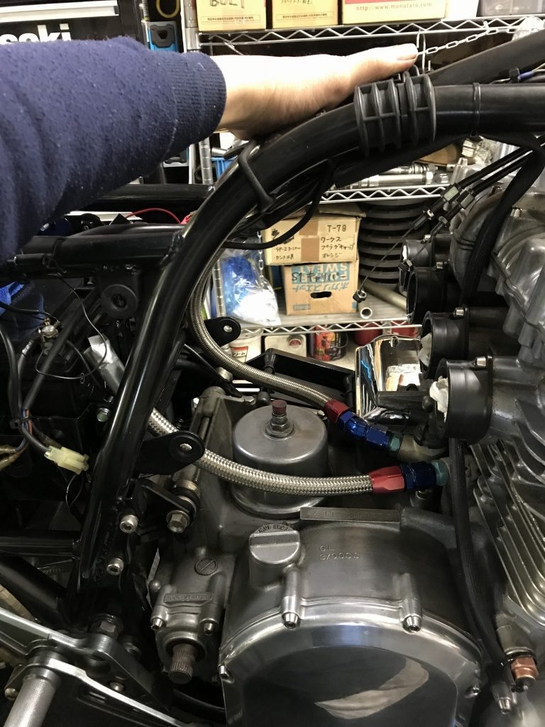 オイルクーラーブラケット変更に伴い、オイルラインは上回しに変更します。