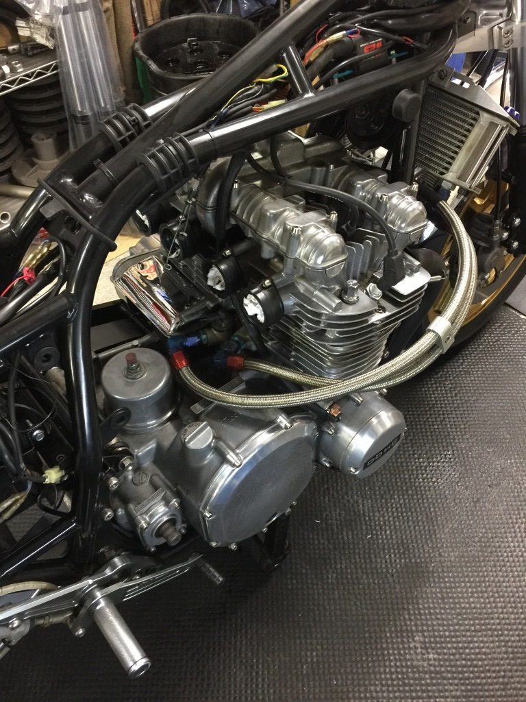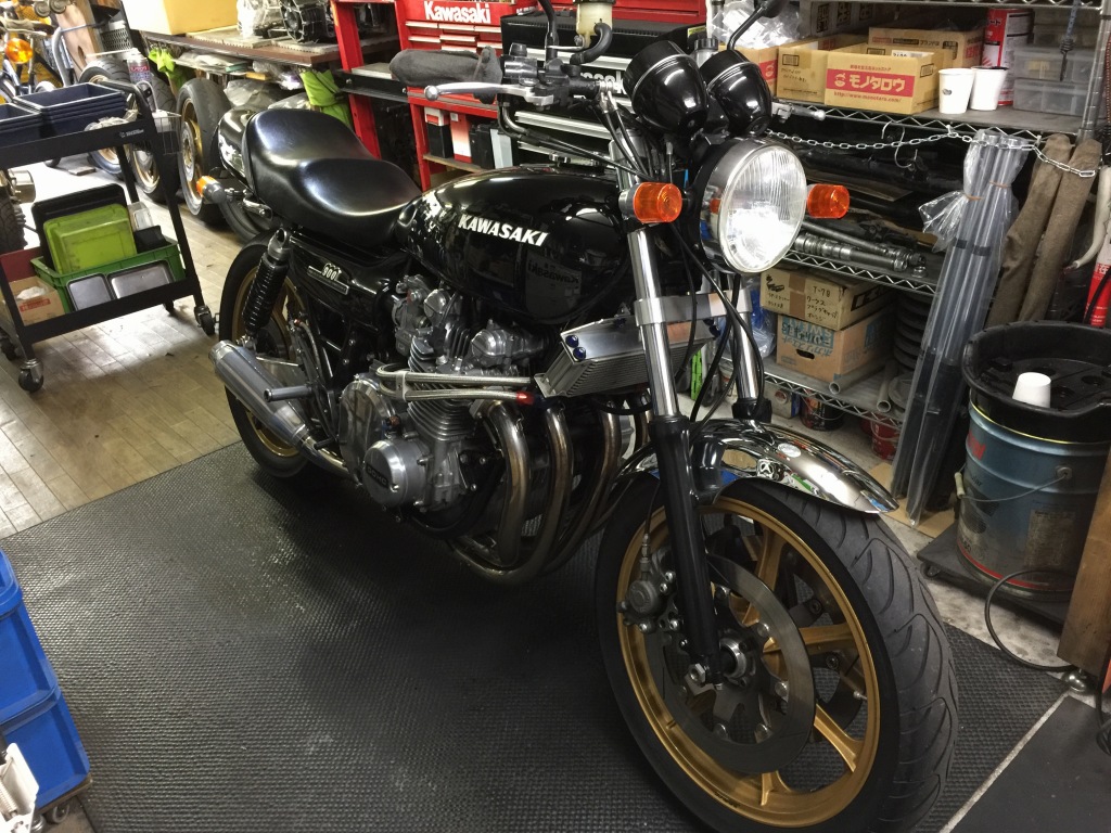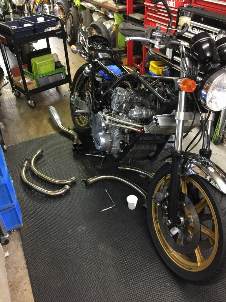 今回のカスタムは、ワークスバックステップ、メガホンマフラー、ワークスオイルクーラーブラケット、機械式クラッチレリーズ取り付けなどのメニューです。