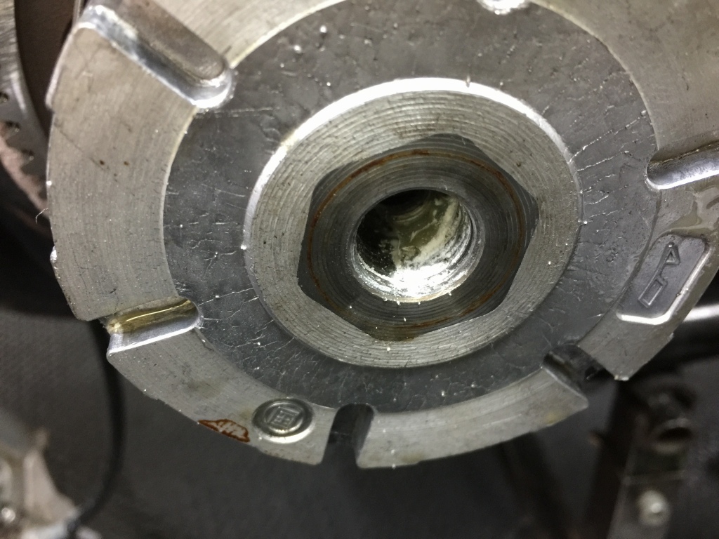 ローター側のネジ山は無事でした。テーパー面にネジロック剤が多量に付いているのがわかり、手前のベアリング側にもはみ出しています。