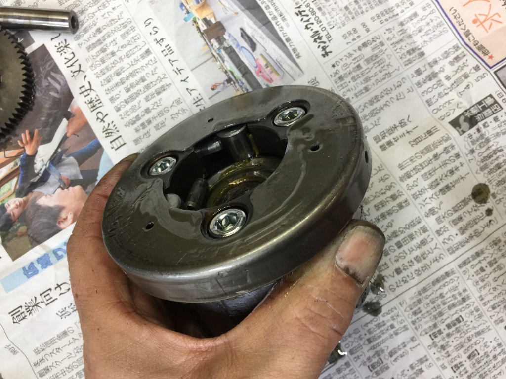 ローターを裏返すと、スタータークラッチの取り付けボルト3本は、完全に緩んで浮いています。