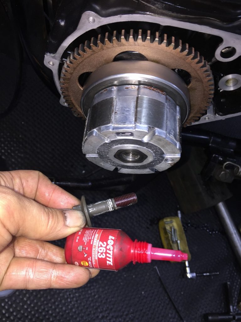 スタータークラッチの取り付けボルトは、ネジロックを塗布します。