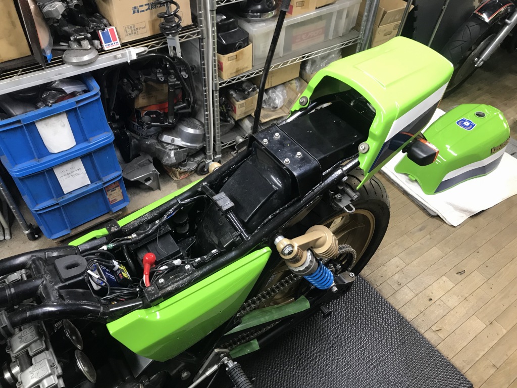 カラーリングはR1カラーに変更。タンクは事故で凹んだところを板金修理してあります。