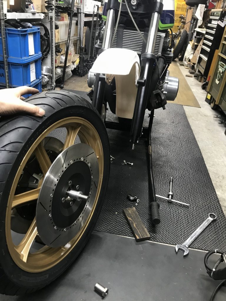 フロントフェンダーを交換するので、ホイールを外します。
