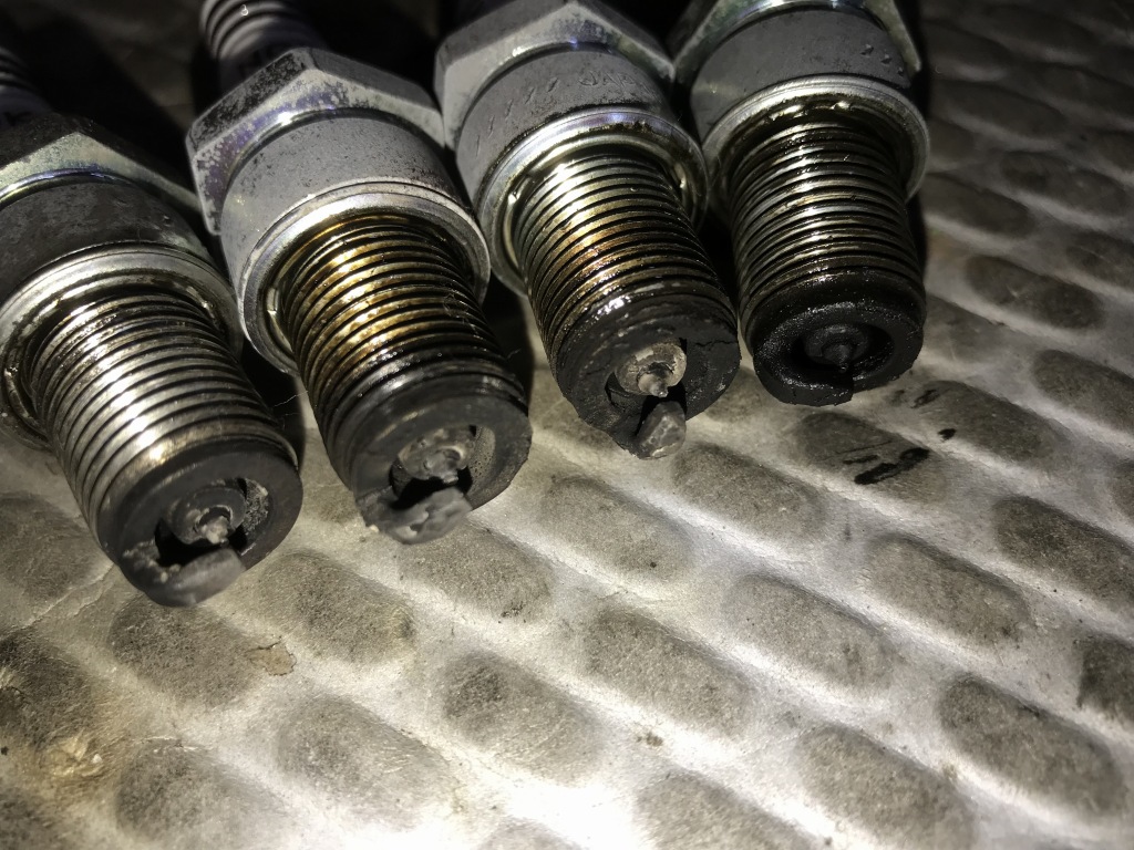 イリジュームプラグでしたが、4気筒ともかなりのカーボン堆積で、1番は完全にかぶっています。