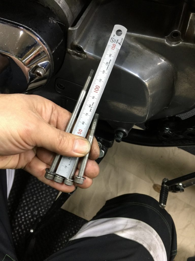 長さを測ると120ミリ、純正は125ミリなので5ミリ短いです。ここはクランクケースの雌ネジを労わりたいので、必ず純正長さのボルトを使用してください。