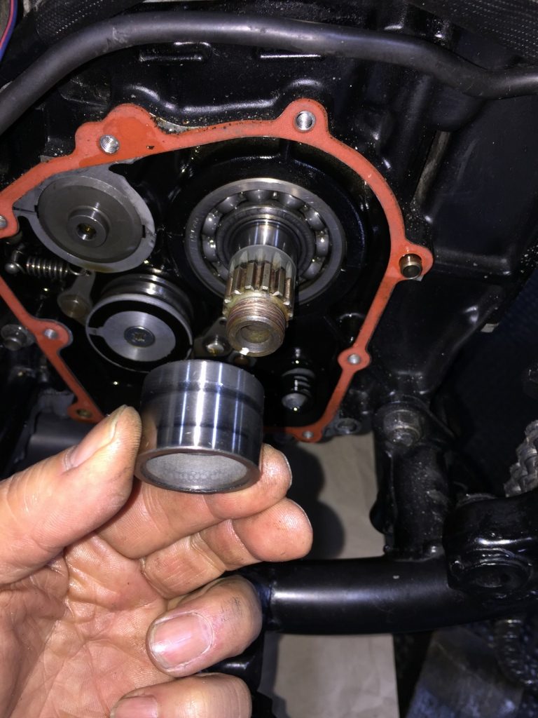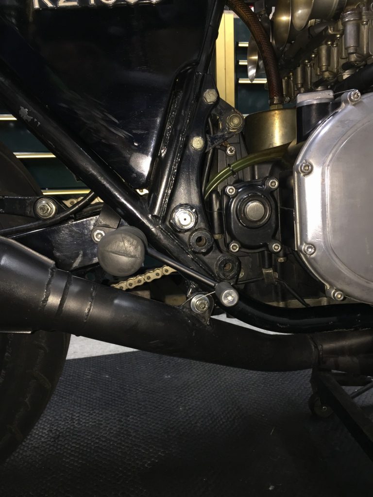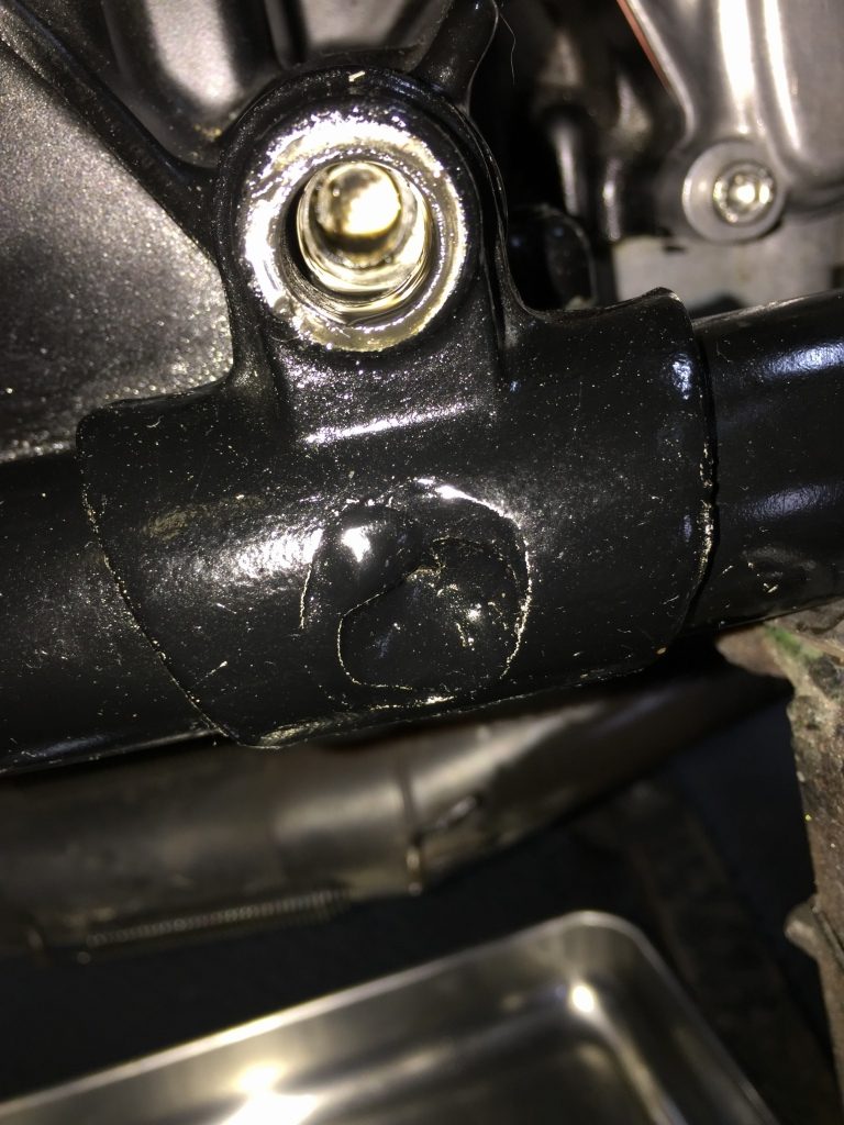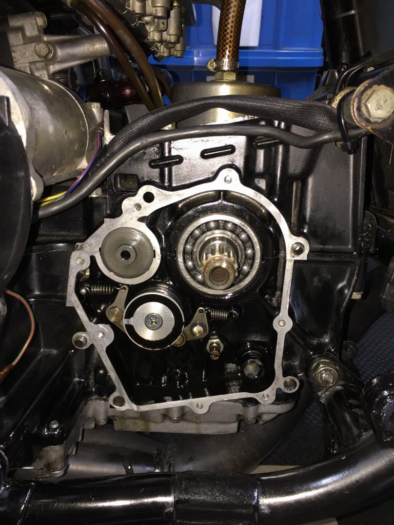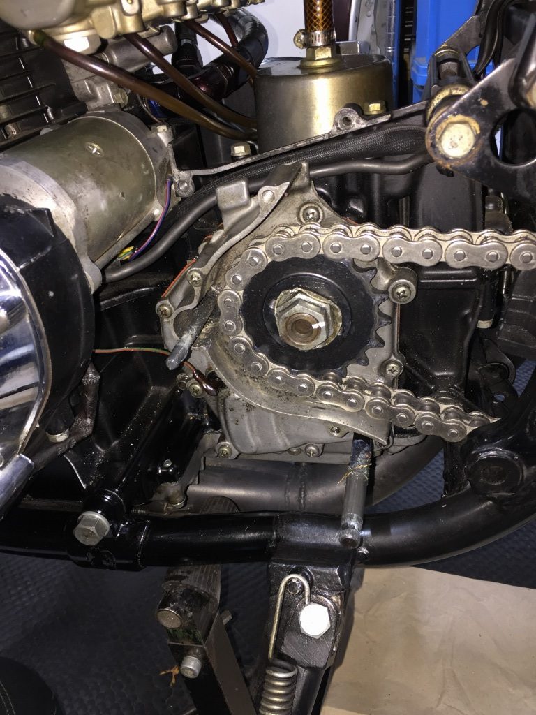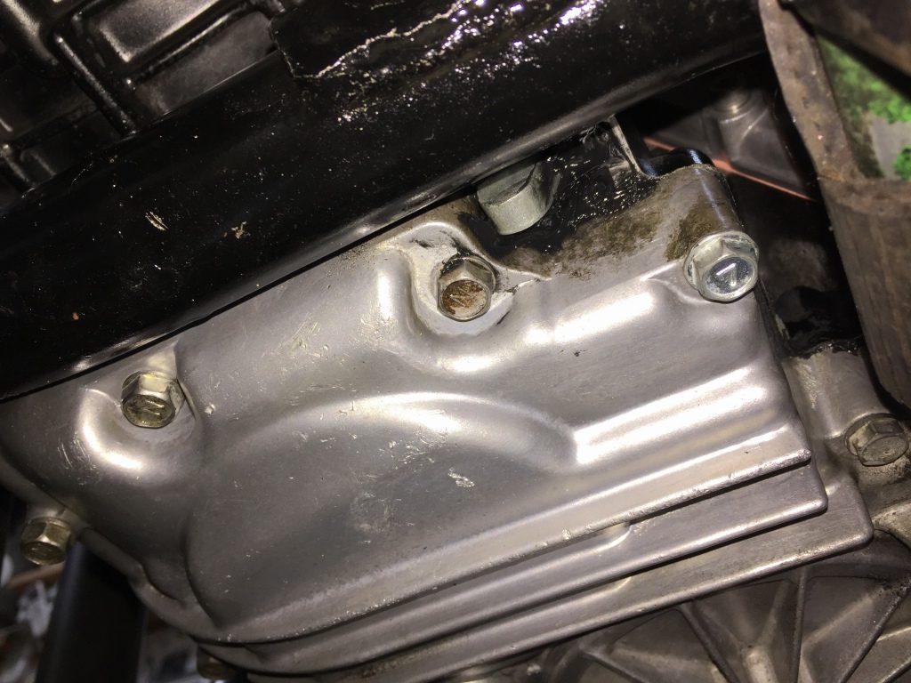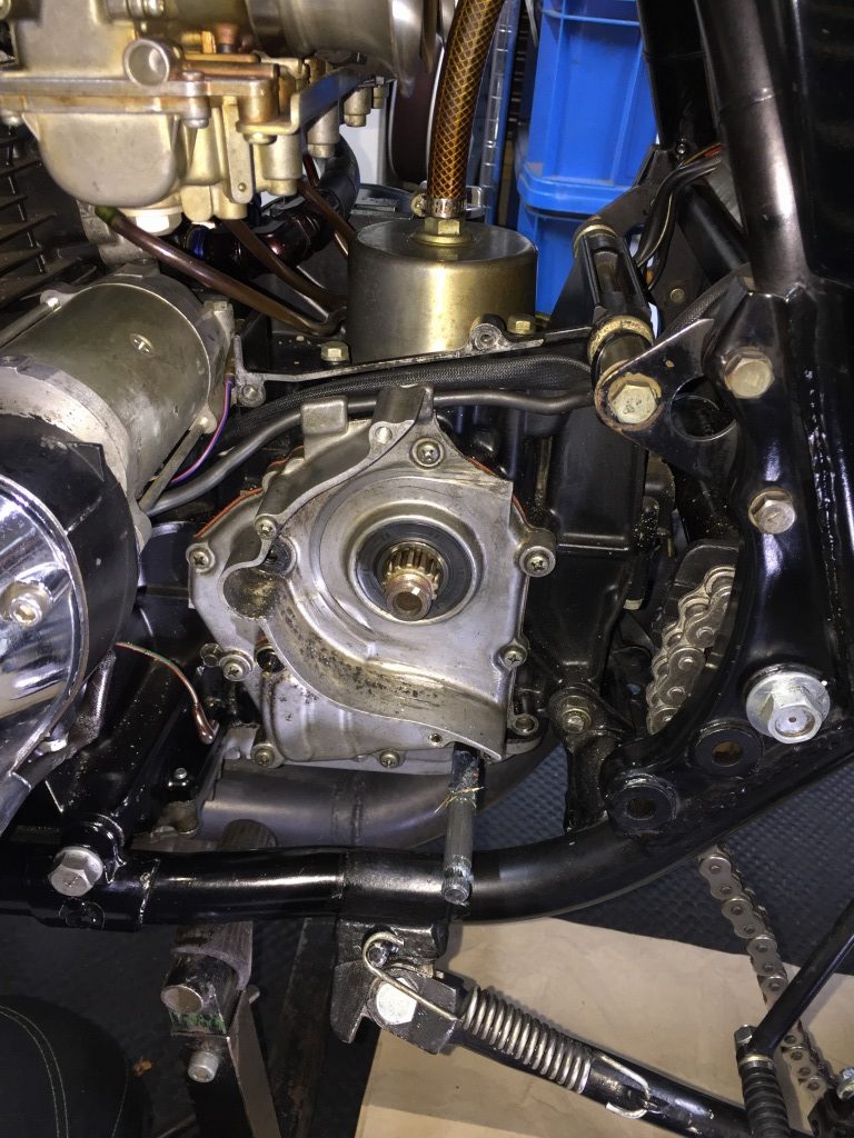 スプロケットを外します。ミッションカバーは耳の部分が折れており、シフトシャフトのオイルシールからのオイル漏れが酷い状態です。