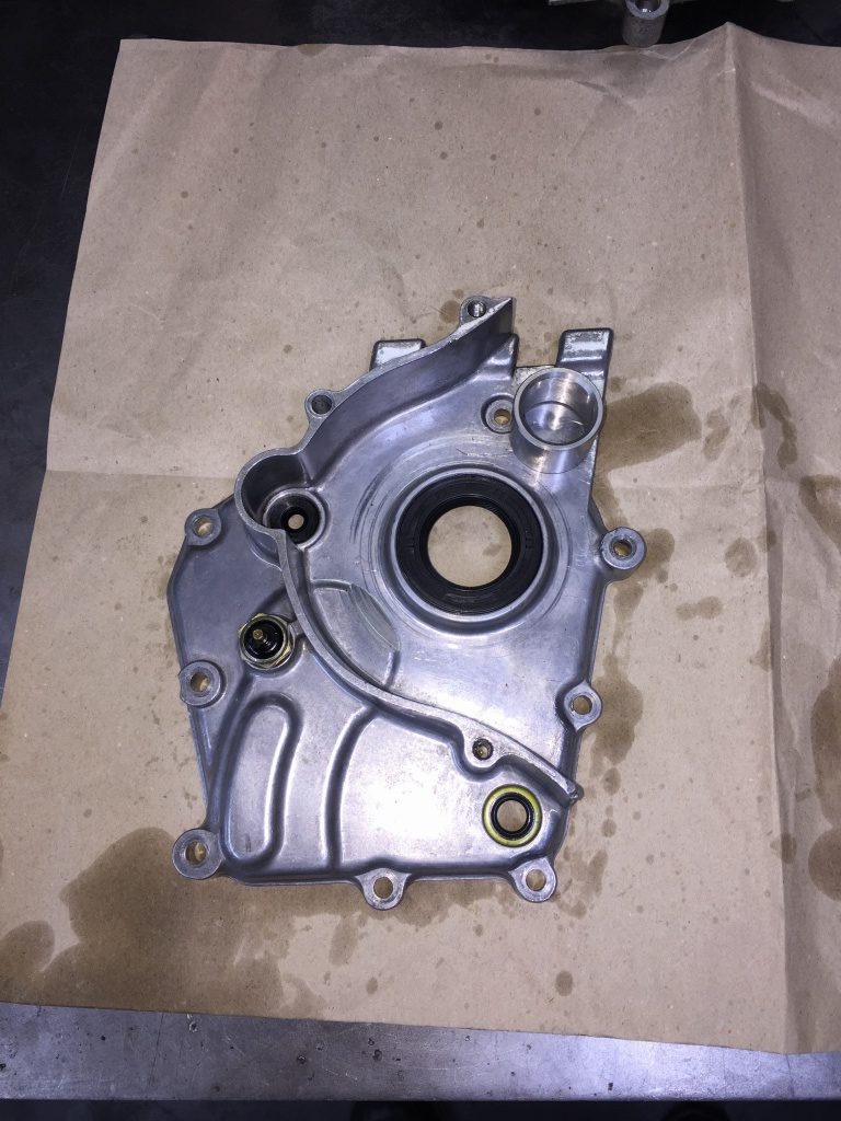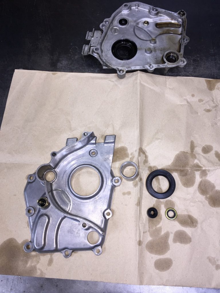 手前がお持ち込みの交換用ミッションカバーです。オイルシールは新品交換します。