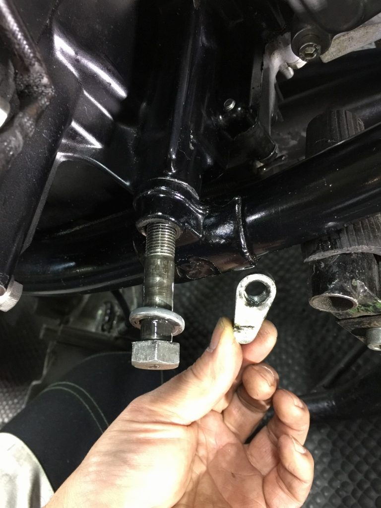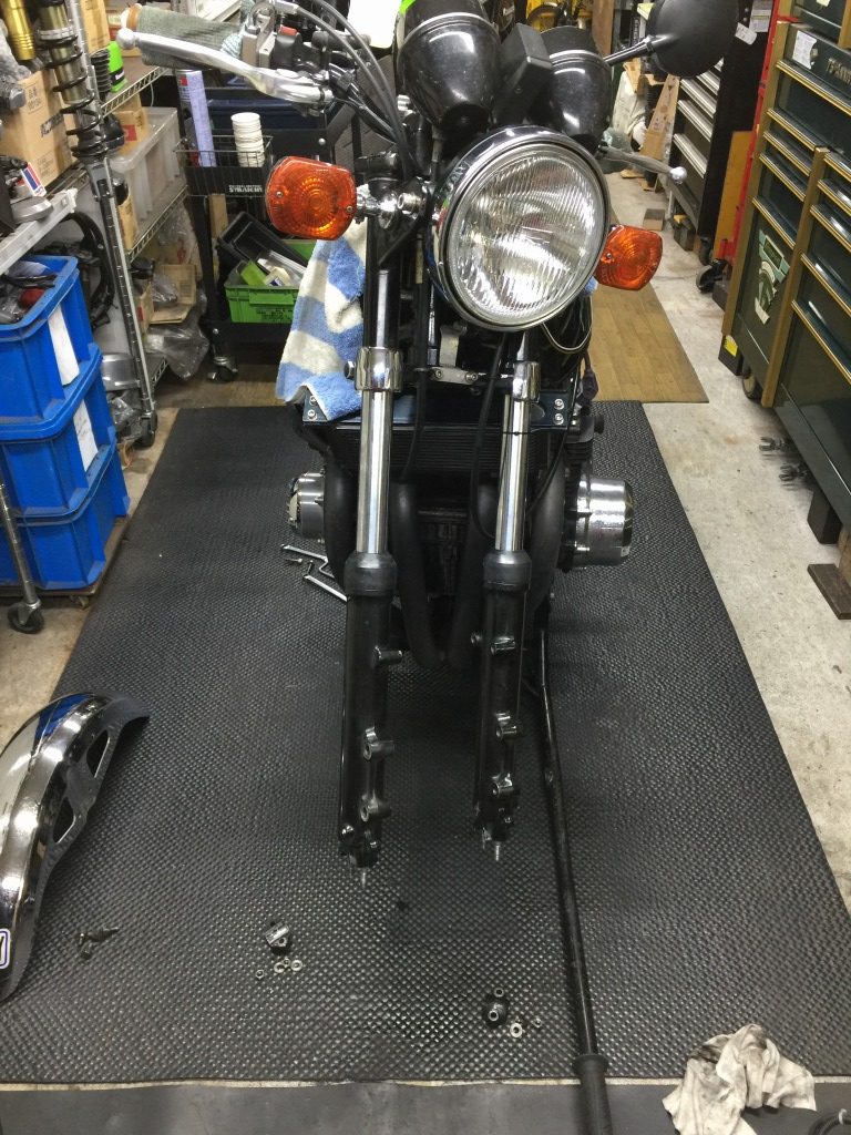 キャリパーを前置きにするので、フォークを抜きます。