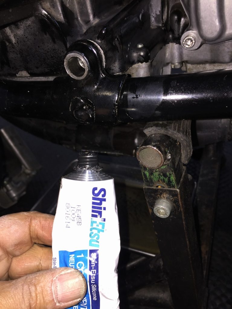 暫定の処置として、液体ガスケットで塞ぎます。