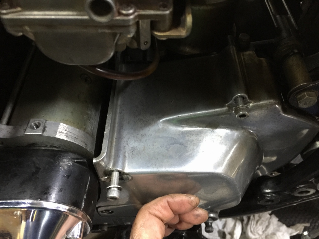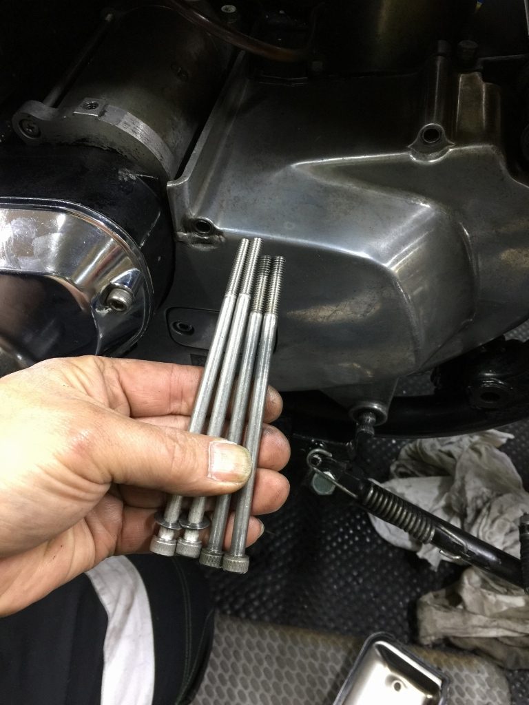 スプロケカバーのボルトを外しますが、前側の長いボルトは純正より短いです。画像にある分だけしかねじ込み代がありません。