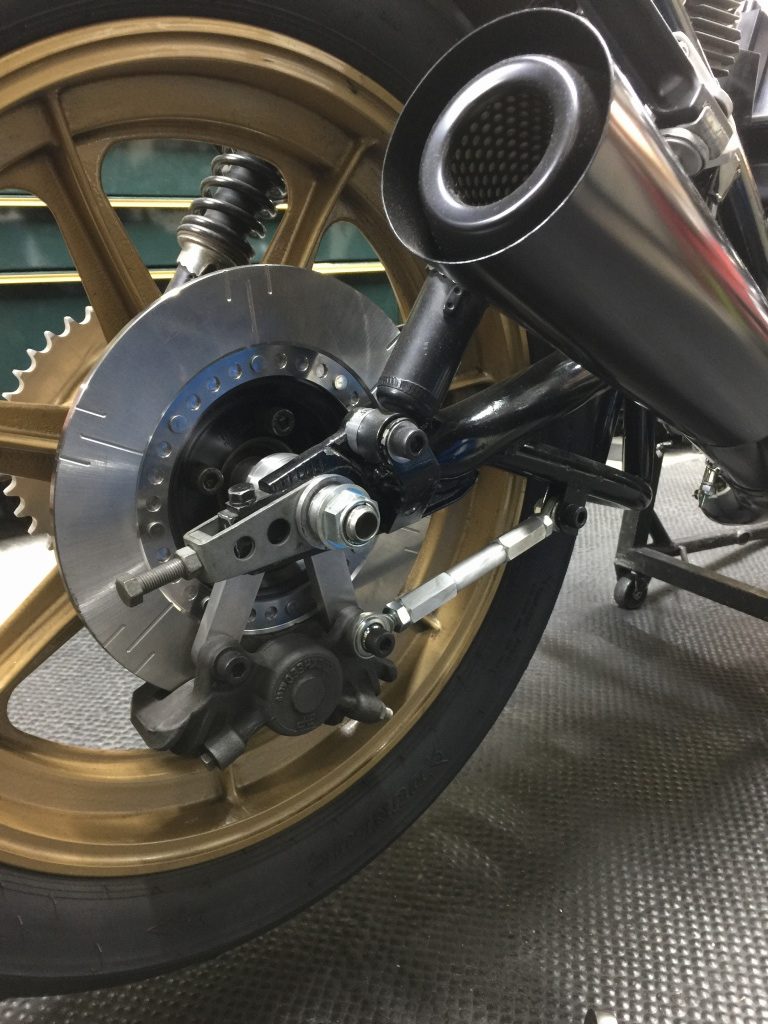 切りっぱなしだったキャリパーサポートもきれいに研磨して仕上げ、ホイールセンターが出るようにカラーを調整し、トルクロッドも新規に製作し取り付けます。