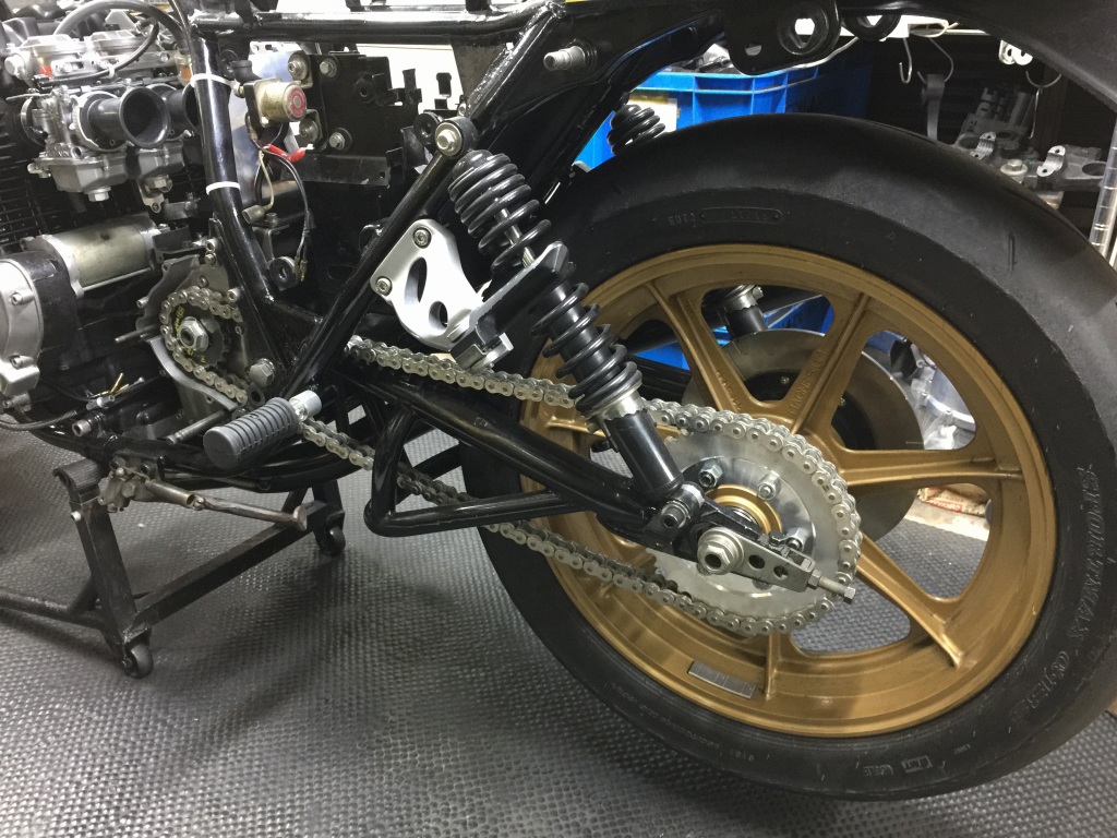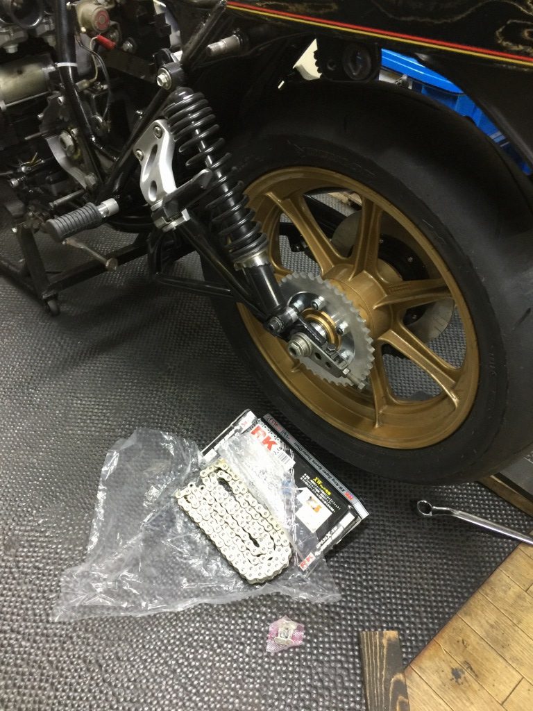 スプロケの歯数は、エンジンの仕様と筑波での目標回転数を想定して決め、それに合わせて新品チェーンの長さを決定します。