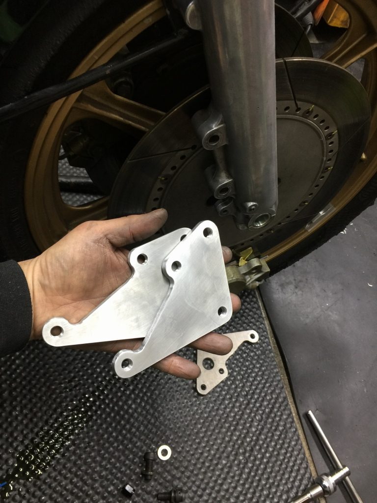 サポートを取り付けます。こちらのS1キャリパーはロッキードピッチですが、パッド摩材の取り付け位置が半径方向に7ミリほど異なり、キャリパーを外側に移動する専用のサポートが必要になります。