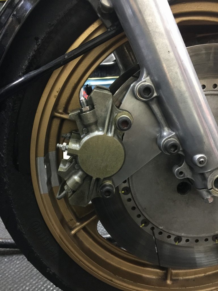 これで、パッドがローター外周に合いました。パッドはデイトナゴールデンのV-MAX初期型用です。