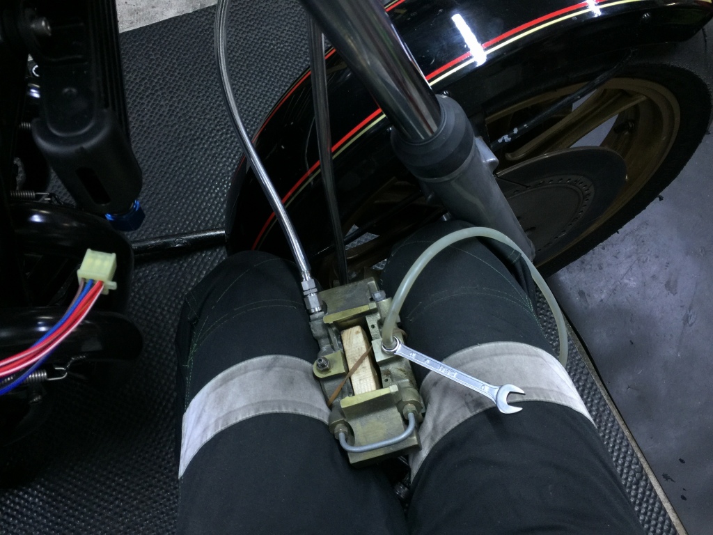 製作したホースを取り付け、フルードを長し、一旦キャリパーを外してエア抜きします。