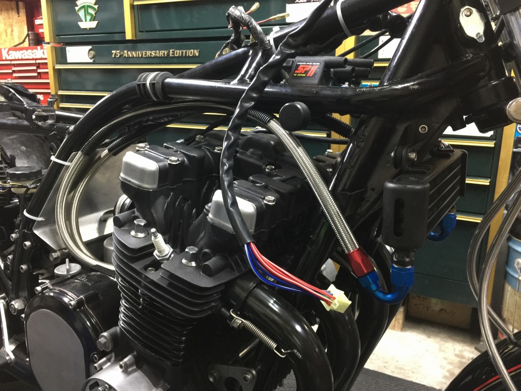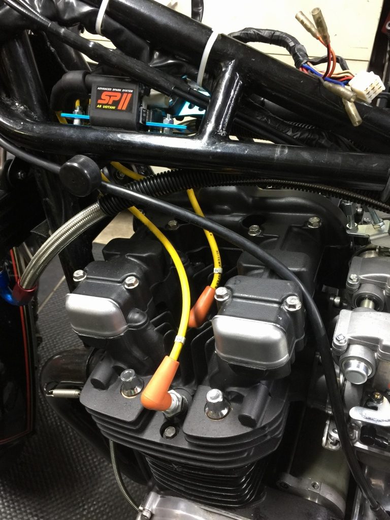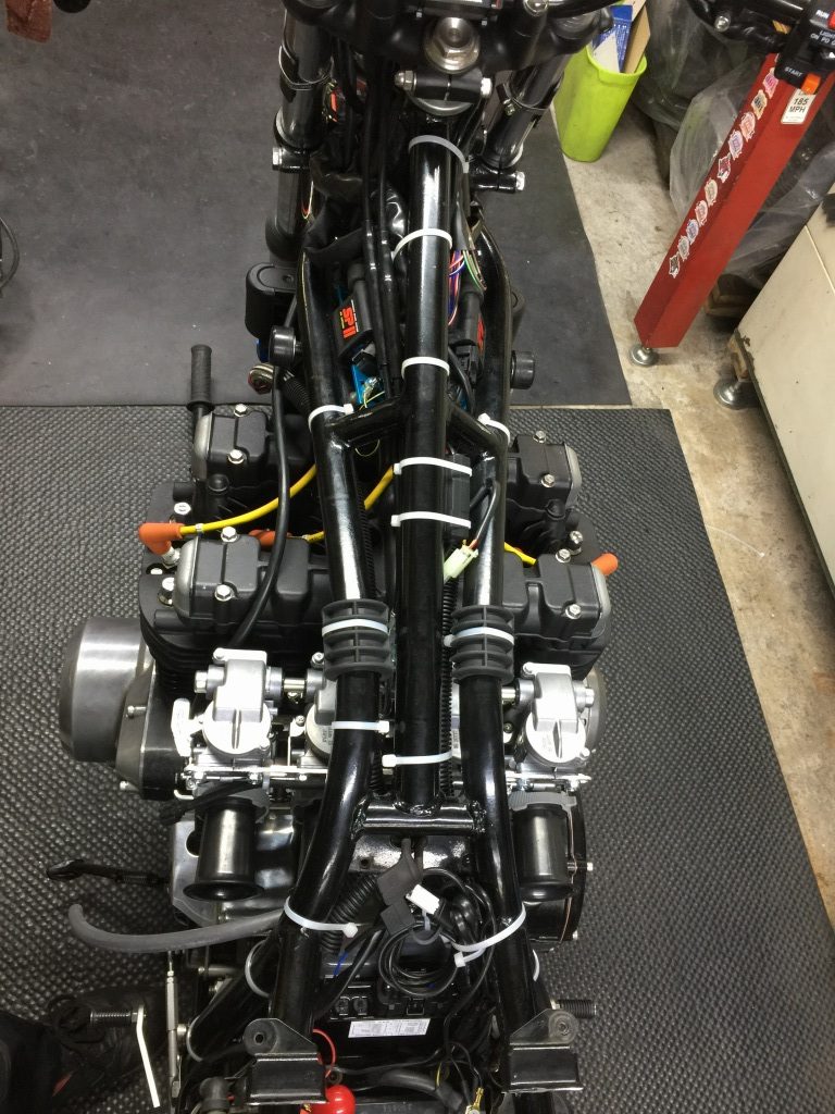 エンジン側はこんな感じ。キャブの整備性を良くするため、なるべく低くレイアウトしています。