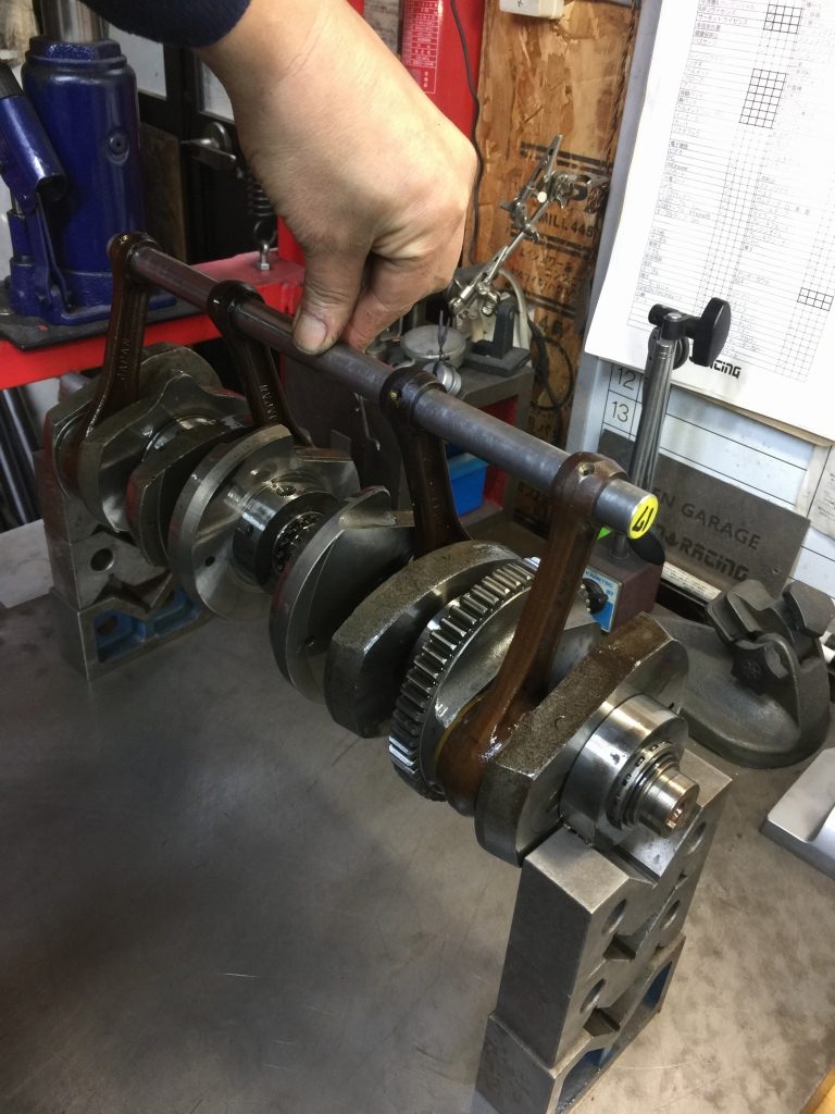 クランクの曲がりを点検。振れは0.01ミリと極少でほぼ真っ直ぐです。