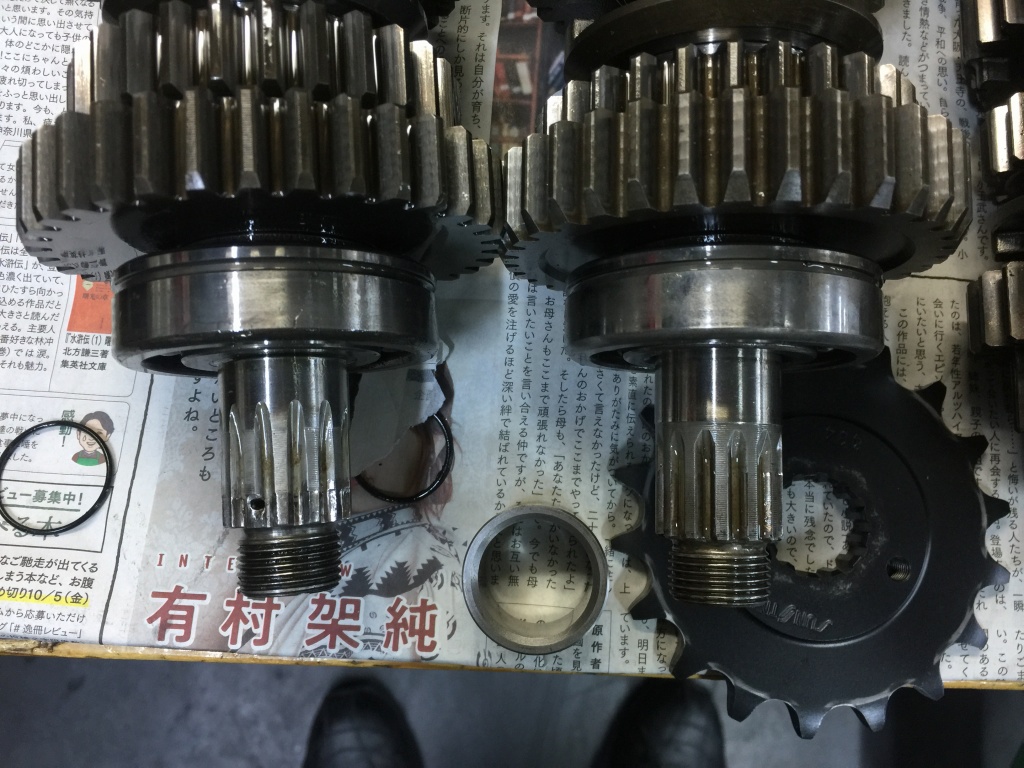 アウトプットシャフトもスプラインが摩耗し、一部欠けているので交換します。左がZ1、右がMk2です。