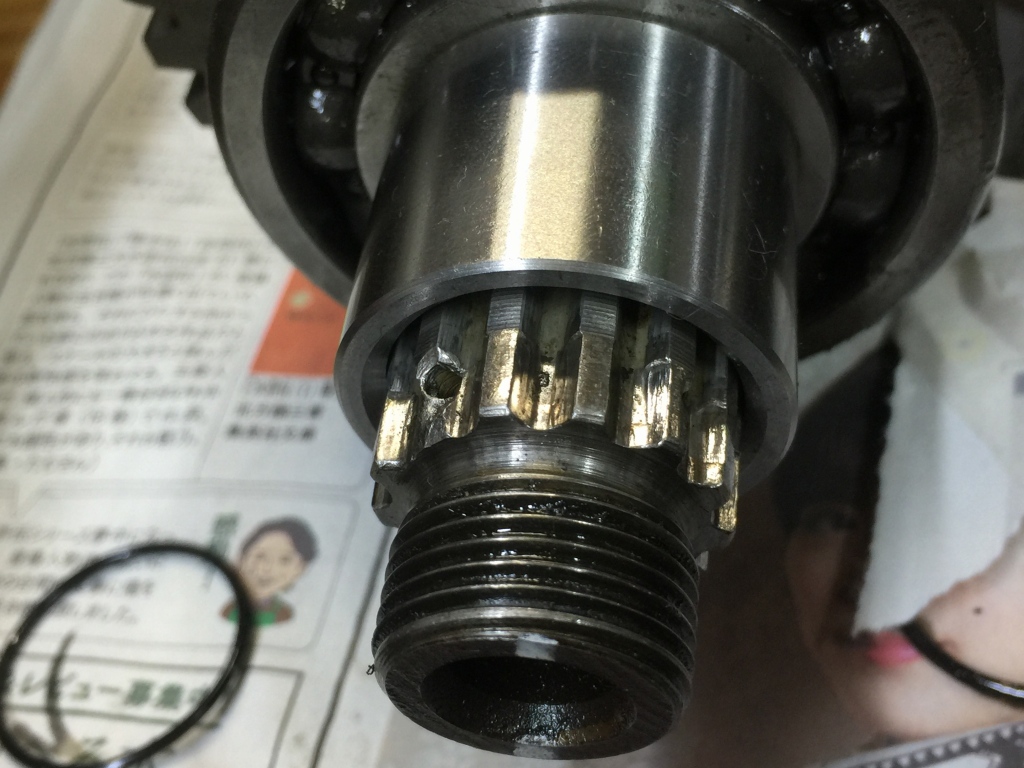 外したZ1の物は、オイル通路の穴の部分でスプラインが欠けています。スプロケットとの掛かりが浅いZ1系では、このようにスプライン自体の摩耗も進行し易いです。
