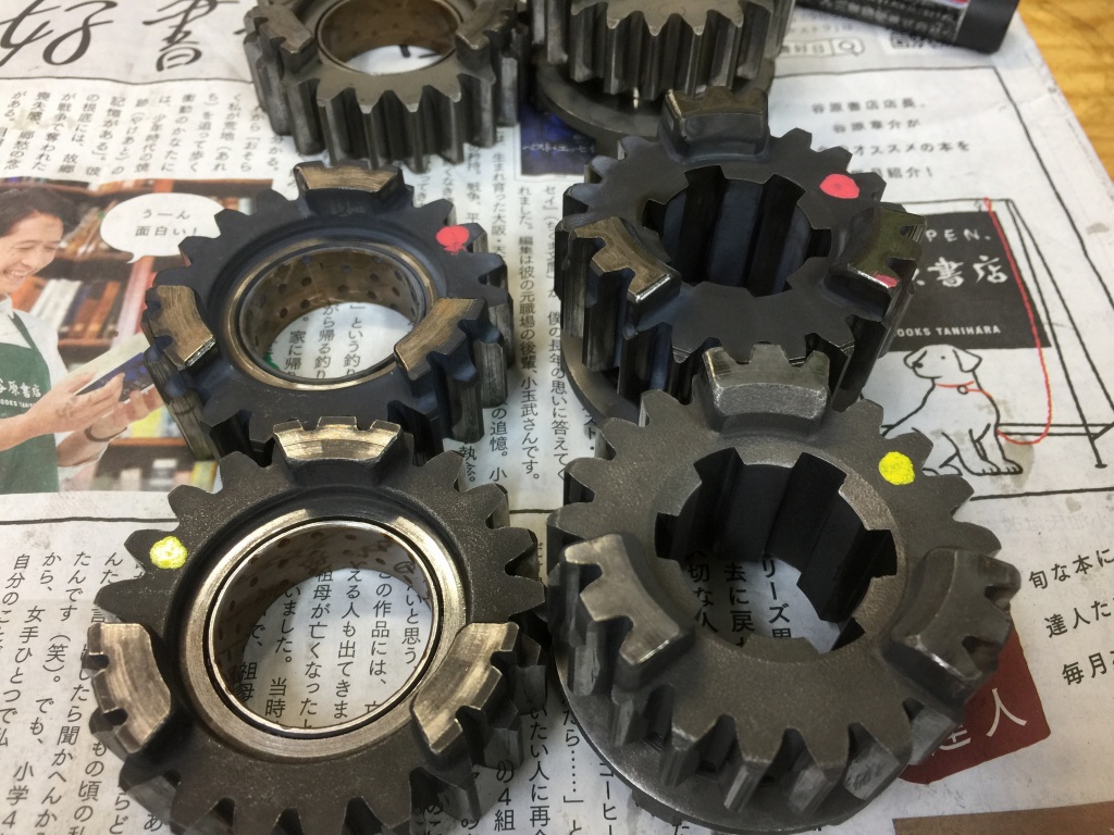 元のギヤが赤印の方。ドグの摩耗が大きいのがわかります。手前が交換用の程度のいいものです。