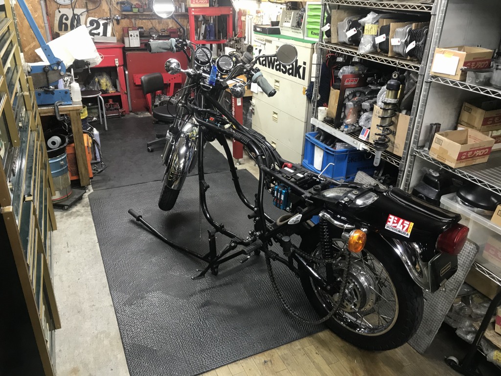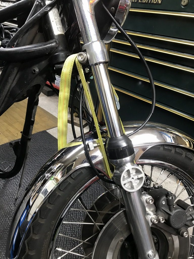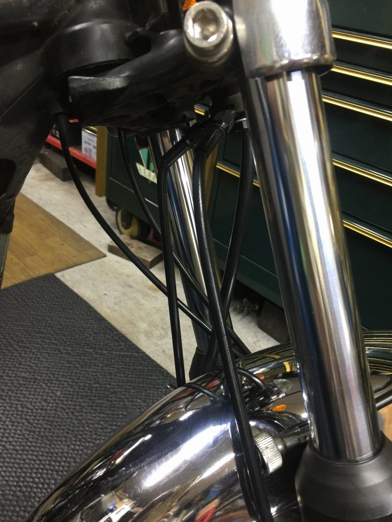 車体を見て、また不具合を発見。フロントブレーキホースが短くて突っ張っています。