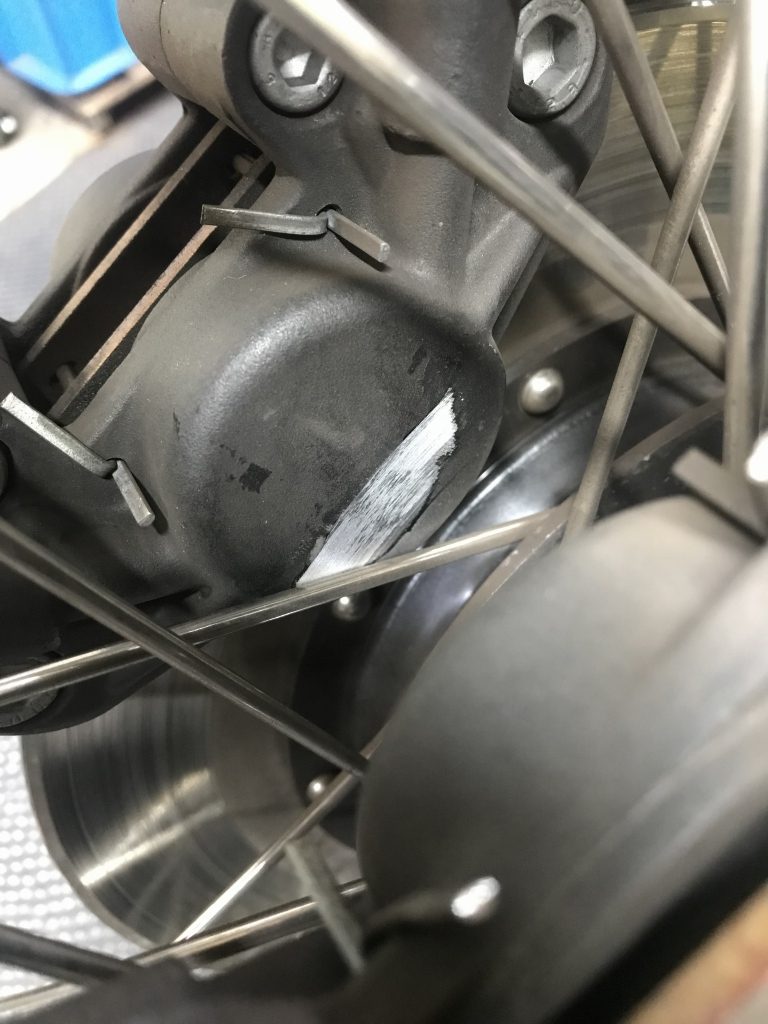 こちらにも不具合が。キャリパーとスポークが干渉しているようです。