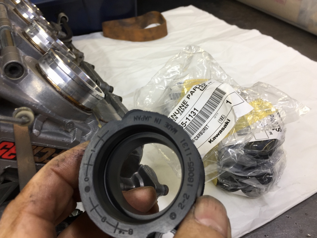 キャブは簡単に抜けたのでよく見ると、アダプターとインシュレーターが適合していません。溝の位置と形状が異なる組み合わせを使っています。これだとバンドをいくら締めてもキャブが脱落することがあります。