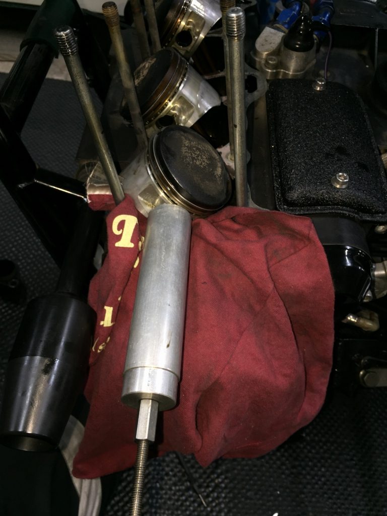 シリンダーには長期保管で付いた、ピストンリングと固着したサビのリングがある気筒も。