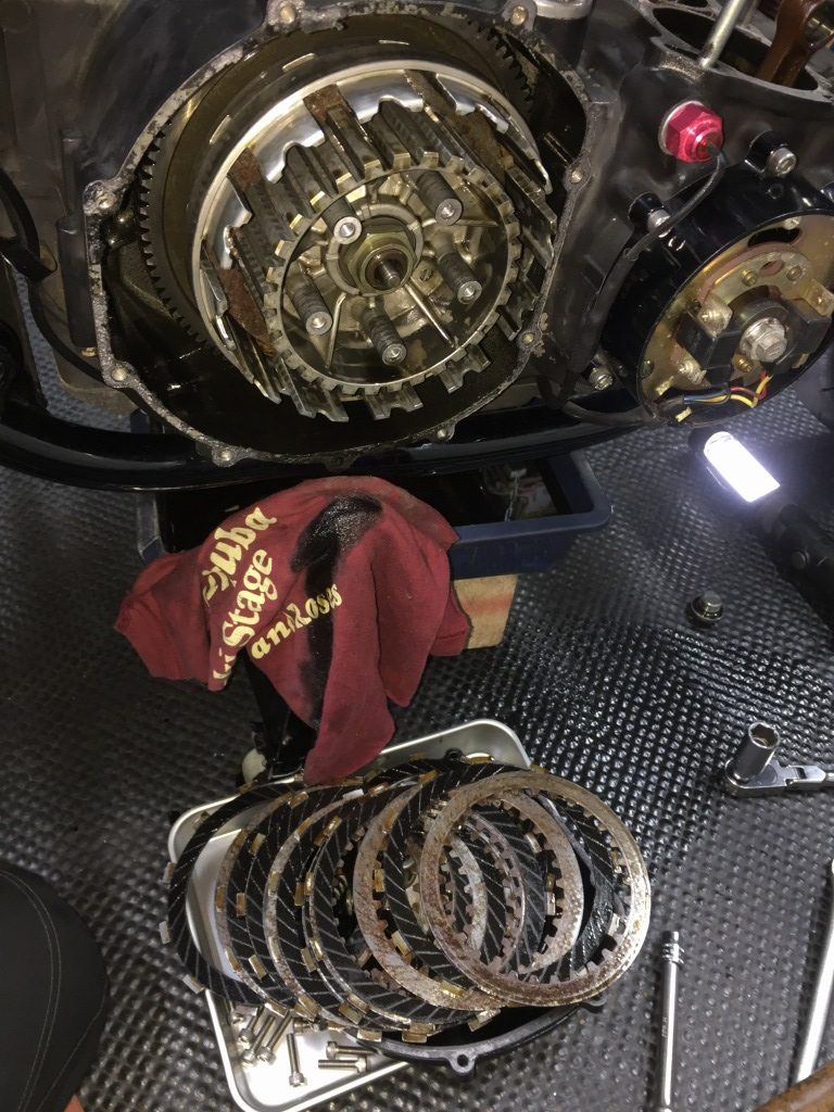 滑っていたクラッチを点検します。スチールプレートはかなり錆びています。フリクションプレートの摩耗も多めです。プレートは全交換します。