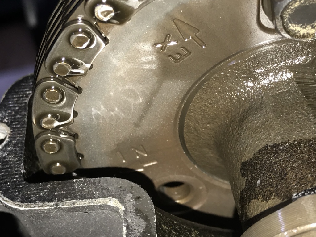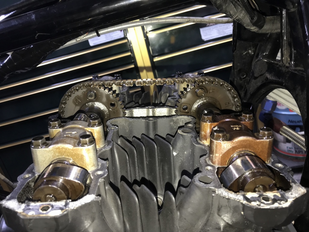 カムスプロケの位置を確認します。インテーク、エキゾーストともに1コマズレています。