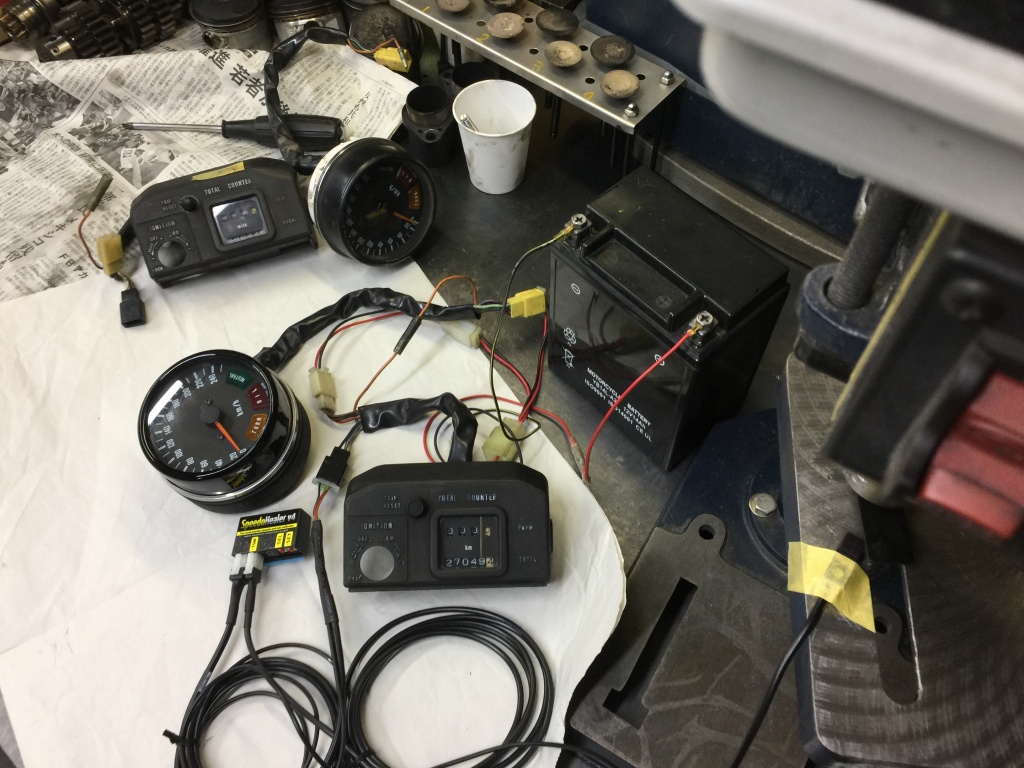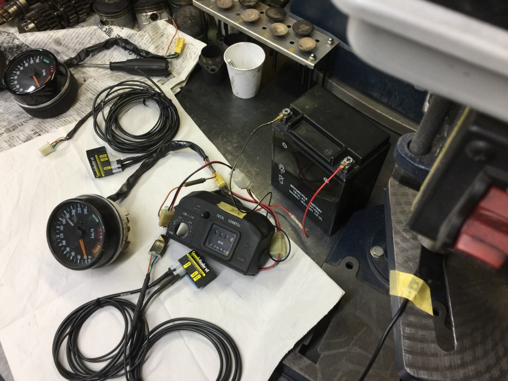 先ずは、2セット製作したハーネスのシステムが正常作動するか台上でチェックします。メーターとオドはチェック用です。