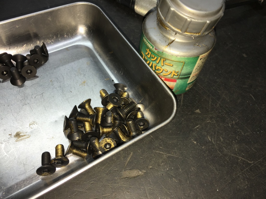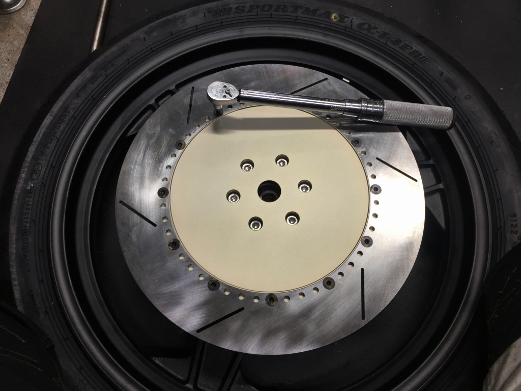 フロントローターを仮組してみましょう。アウターローターのボルトは固着し易いのでカッパーグリスを塗って締め付けます。