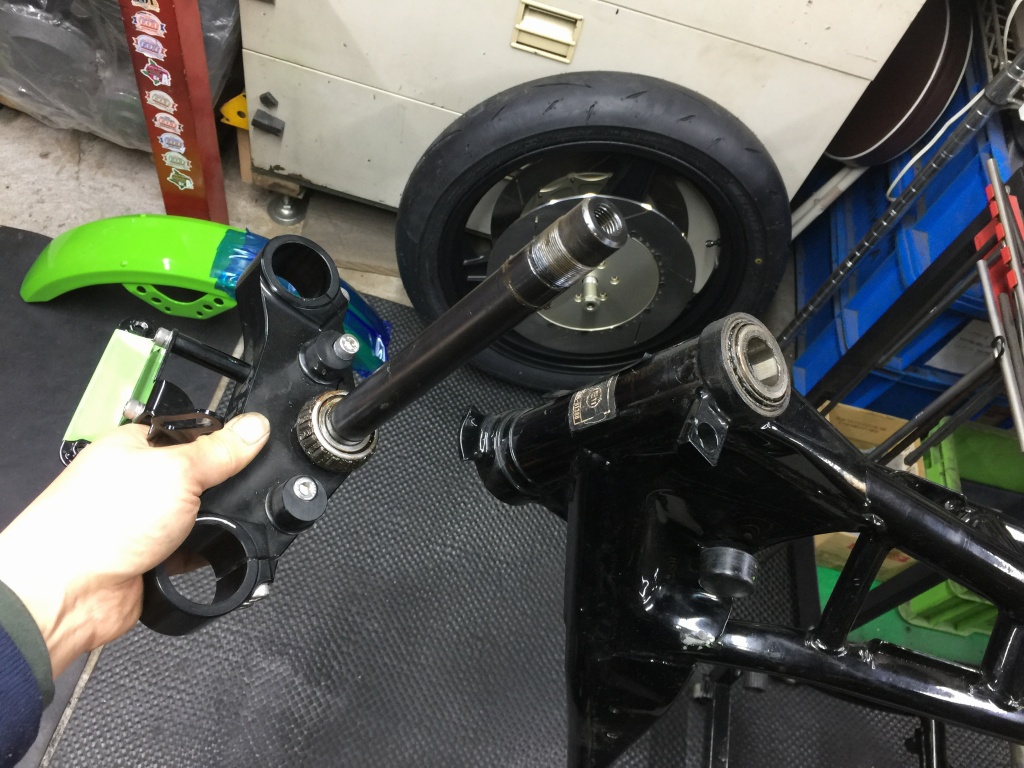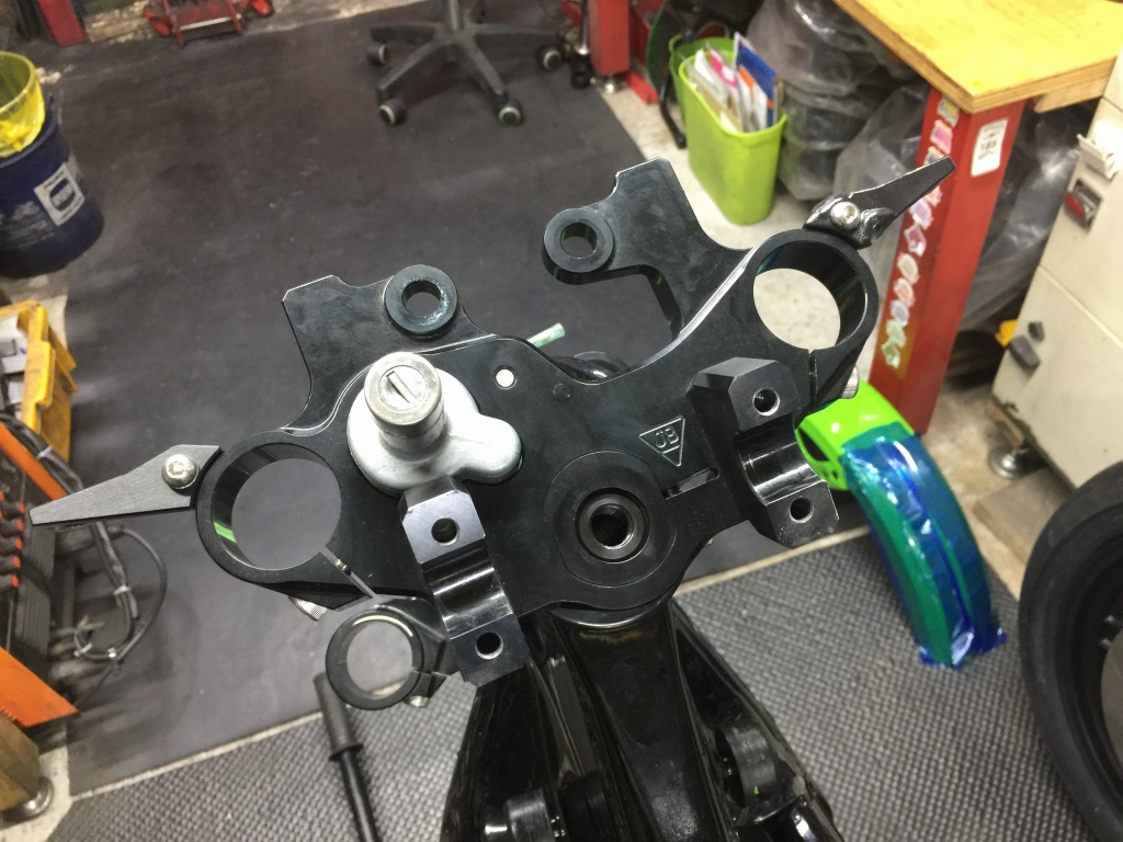 ビトー製のこのステムはオフセット40と45の可変式です。フロント18インチなら45から50は欲しいので、現在の45の状態で適正でしょう。