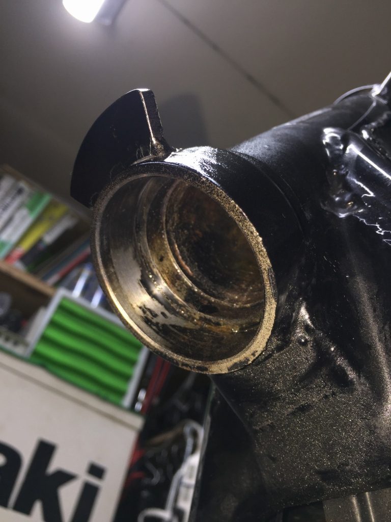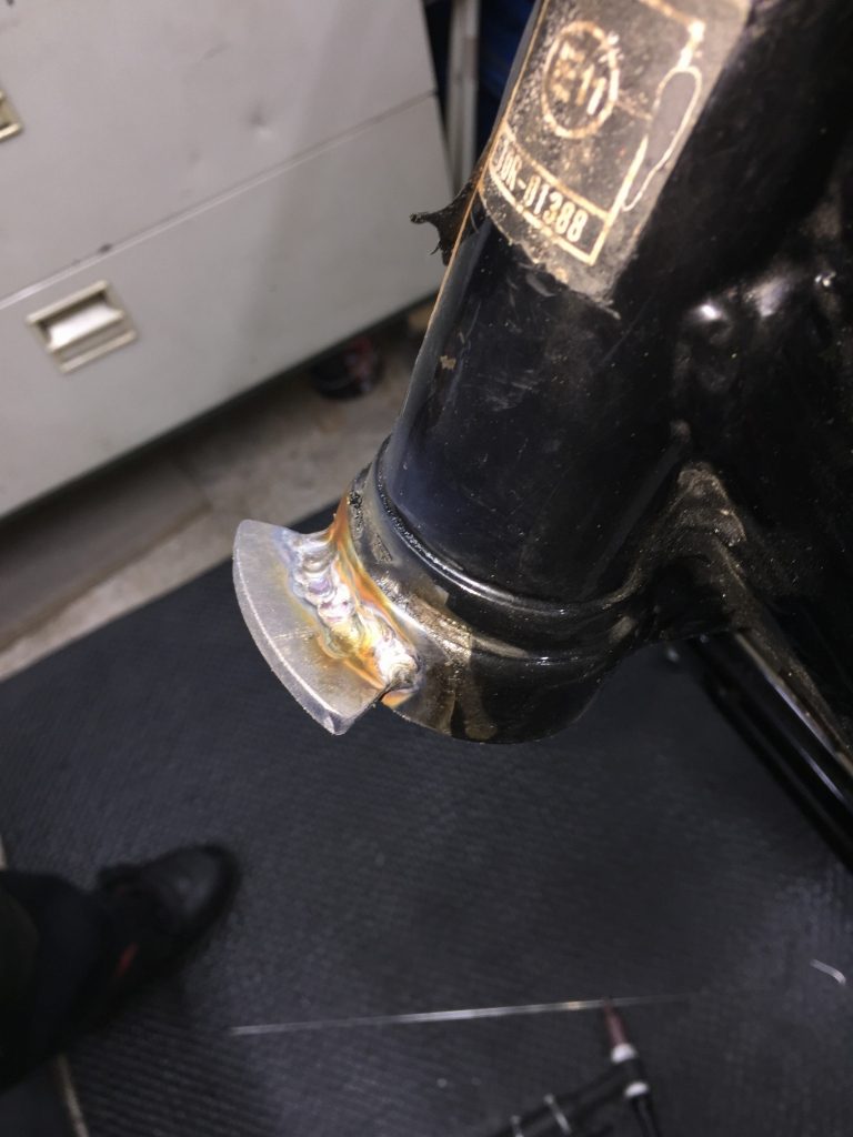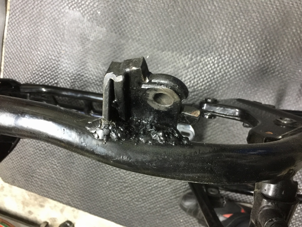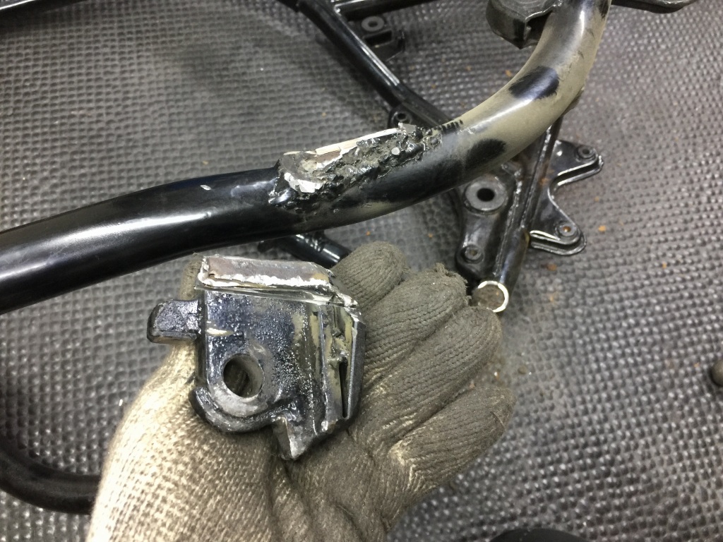 サイドスタンドブラケットの裏側は、補修の溶接が溶け込んでいない状態です。