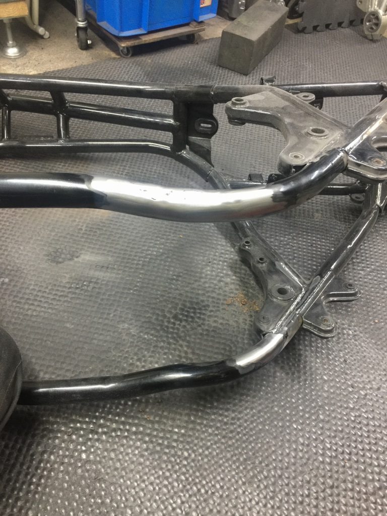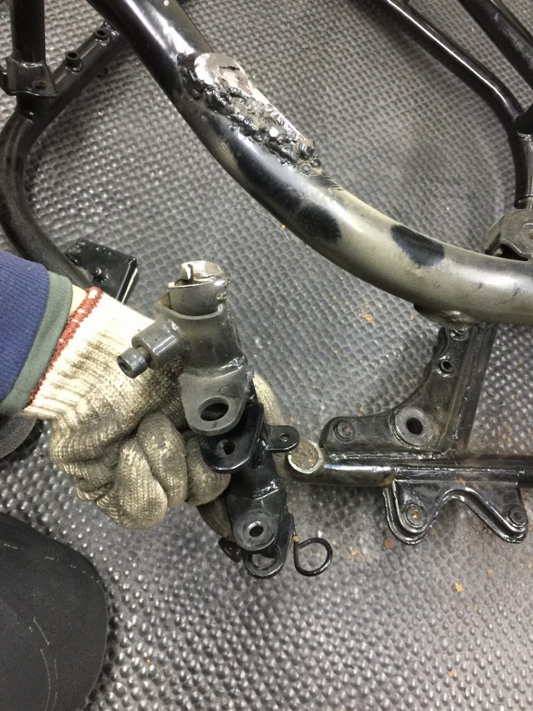 サイドスタンドブラケットの補修痕はこんな感じ。