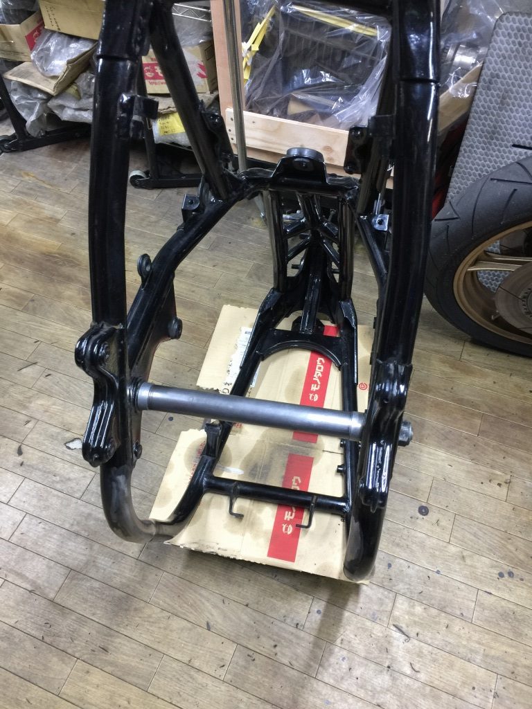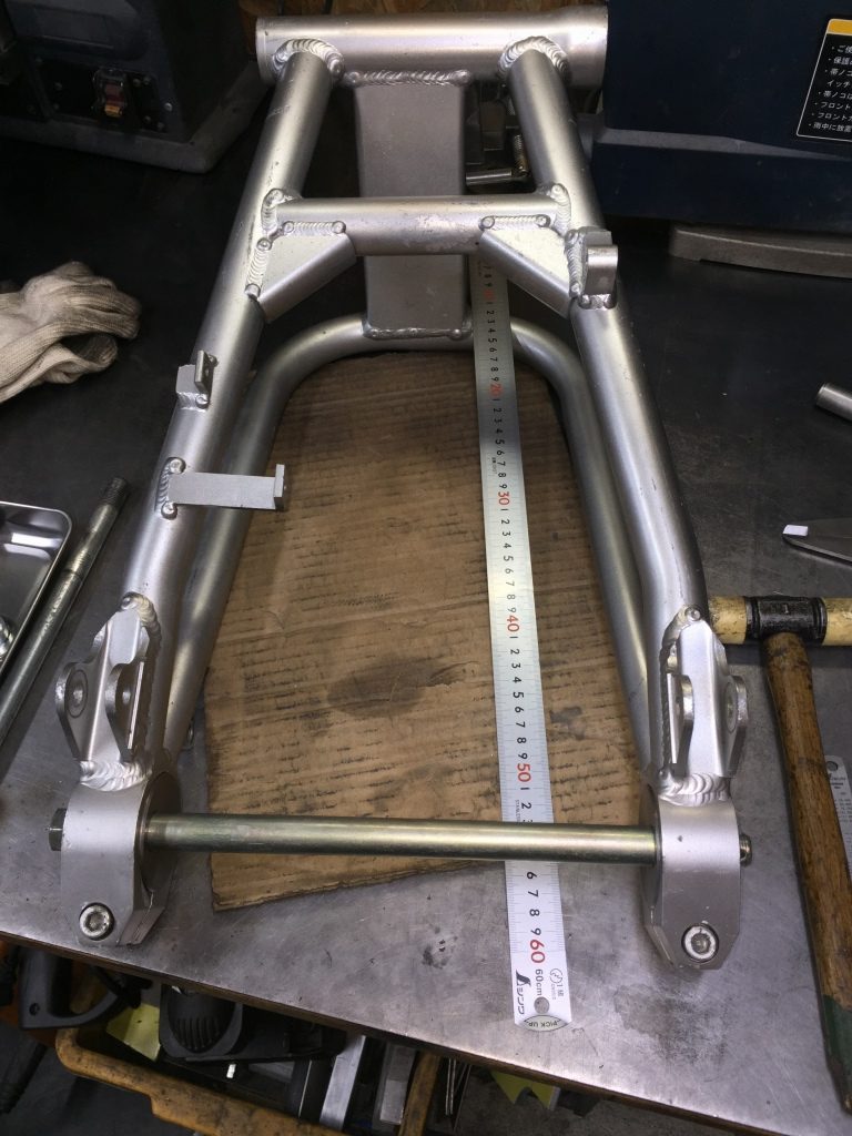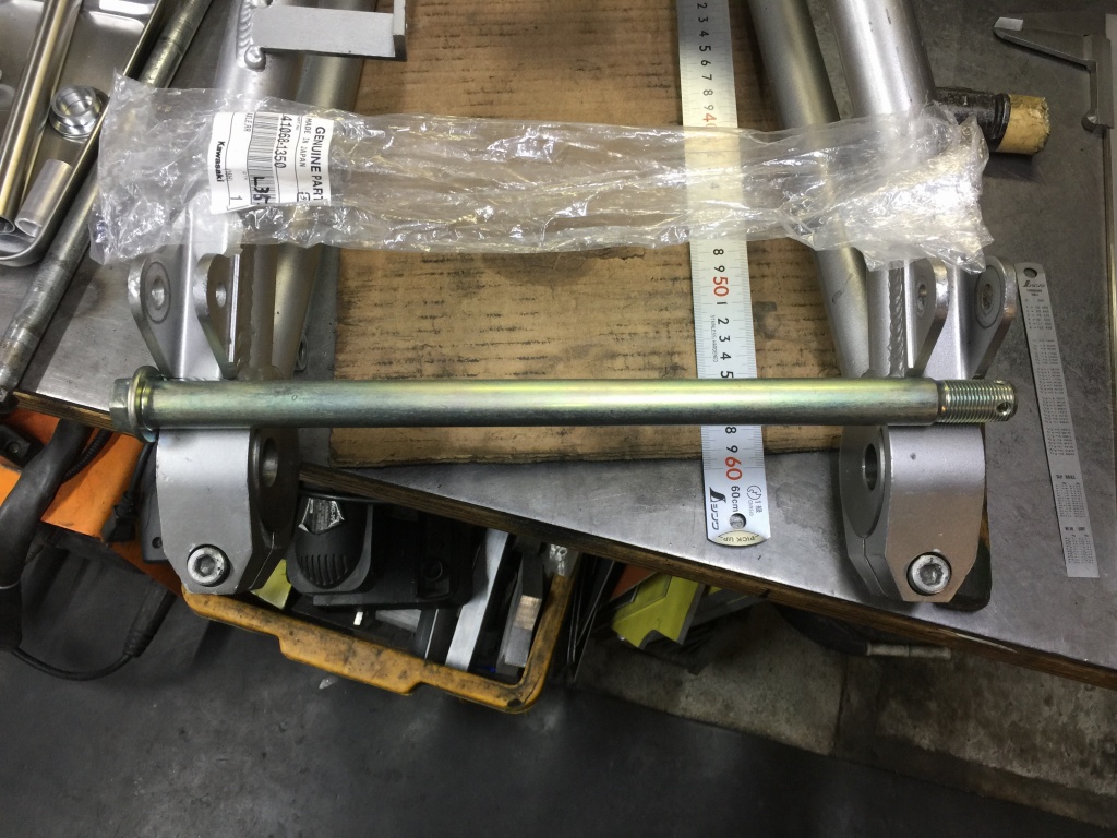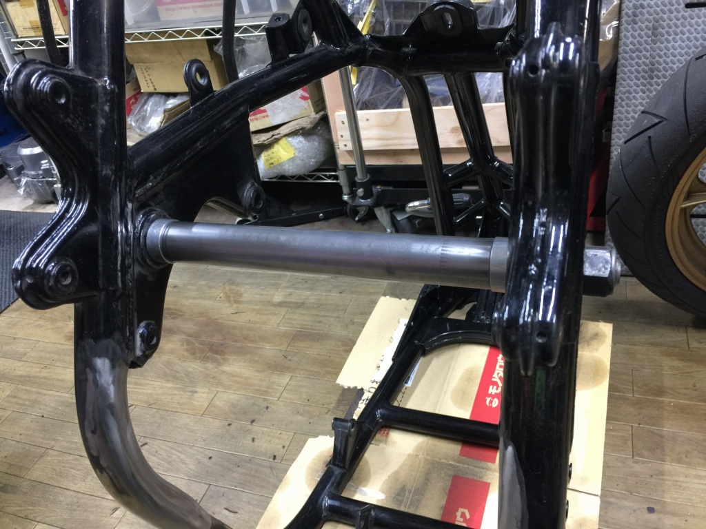 アクスルシャフトはZZR400純正の中空シャフトを使います。このスイングアームにちょうどいい長さです。